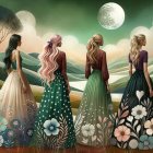 Four women stand with their backs to the viewer, dressed in patterned skirts, gazing at a serene landscape with rolling hills and a full moon above. The scene is colorful and whimsical.