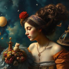 A woman with an elaborate hairstyle adorned with roses gazes thoughtfully, holding a bouquet of flowers. Celestial bodies and an ornate structure enhance the dreamlike, surreal atmosphere.