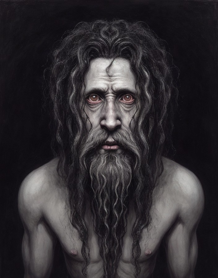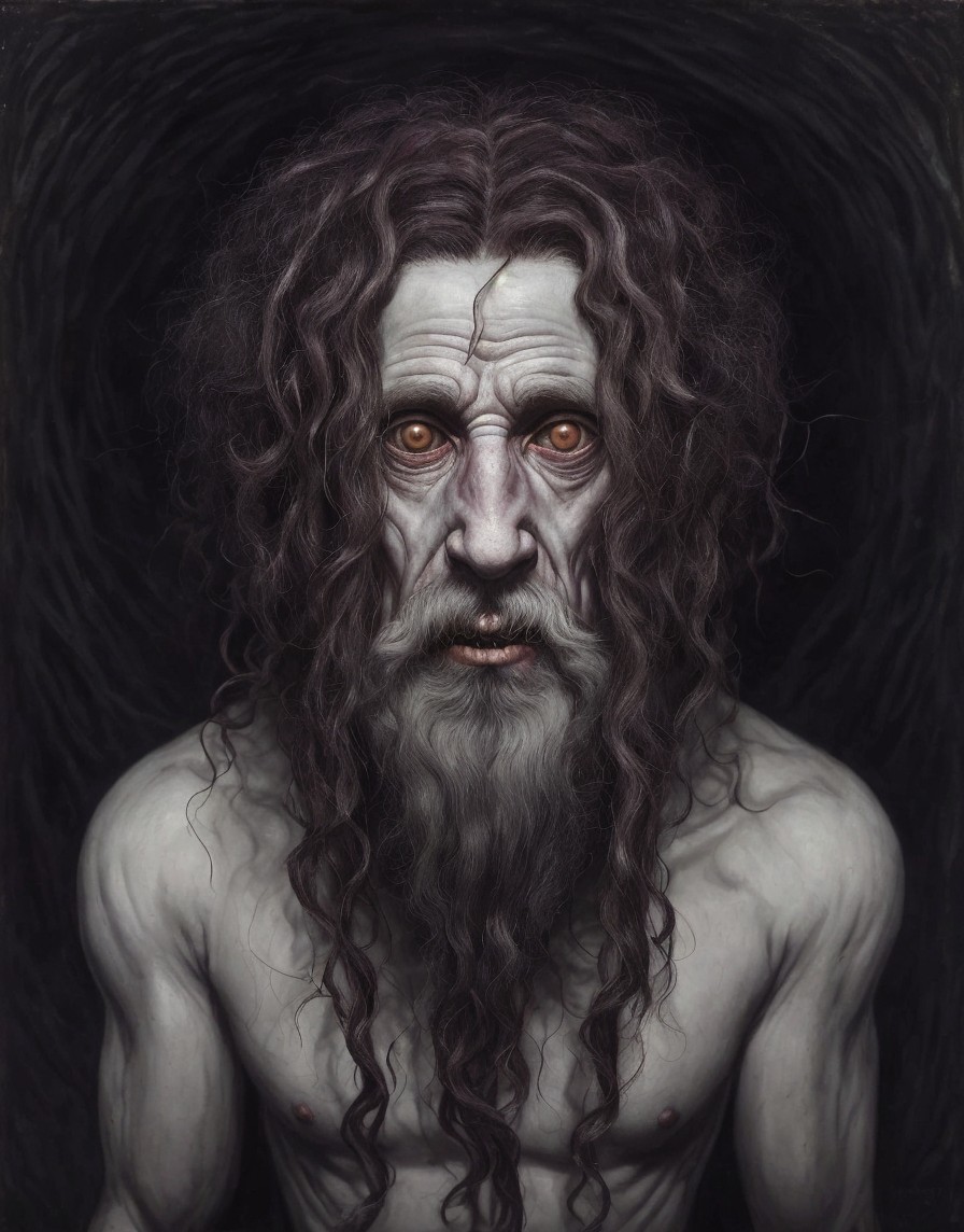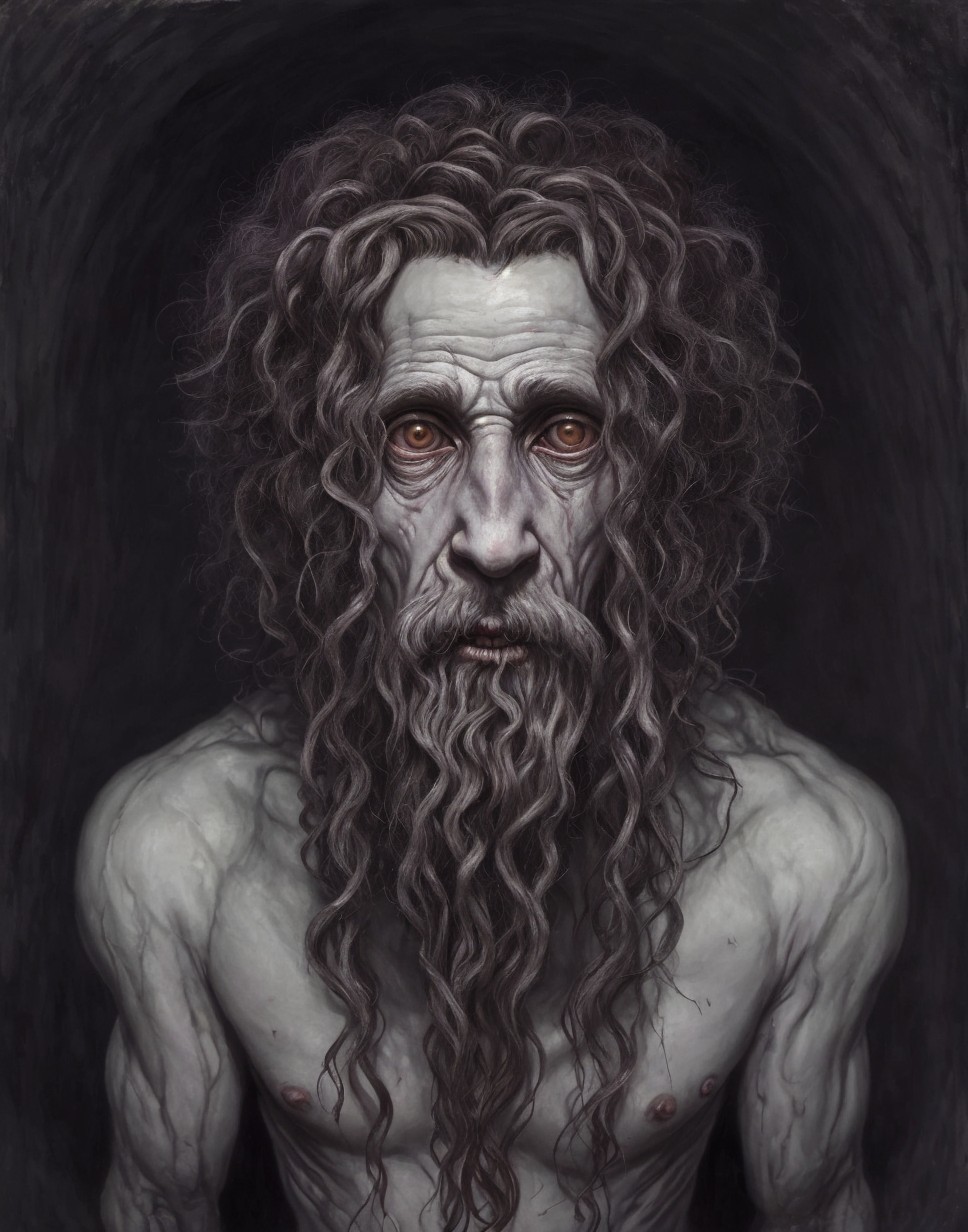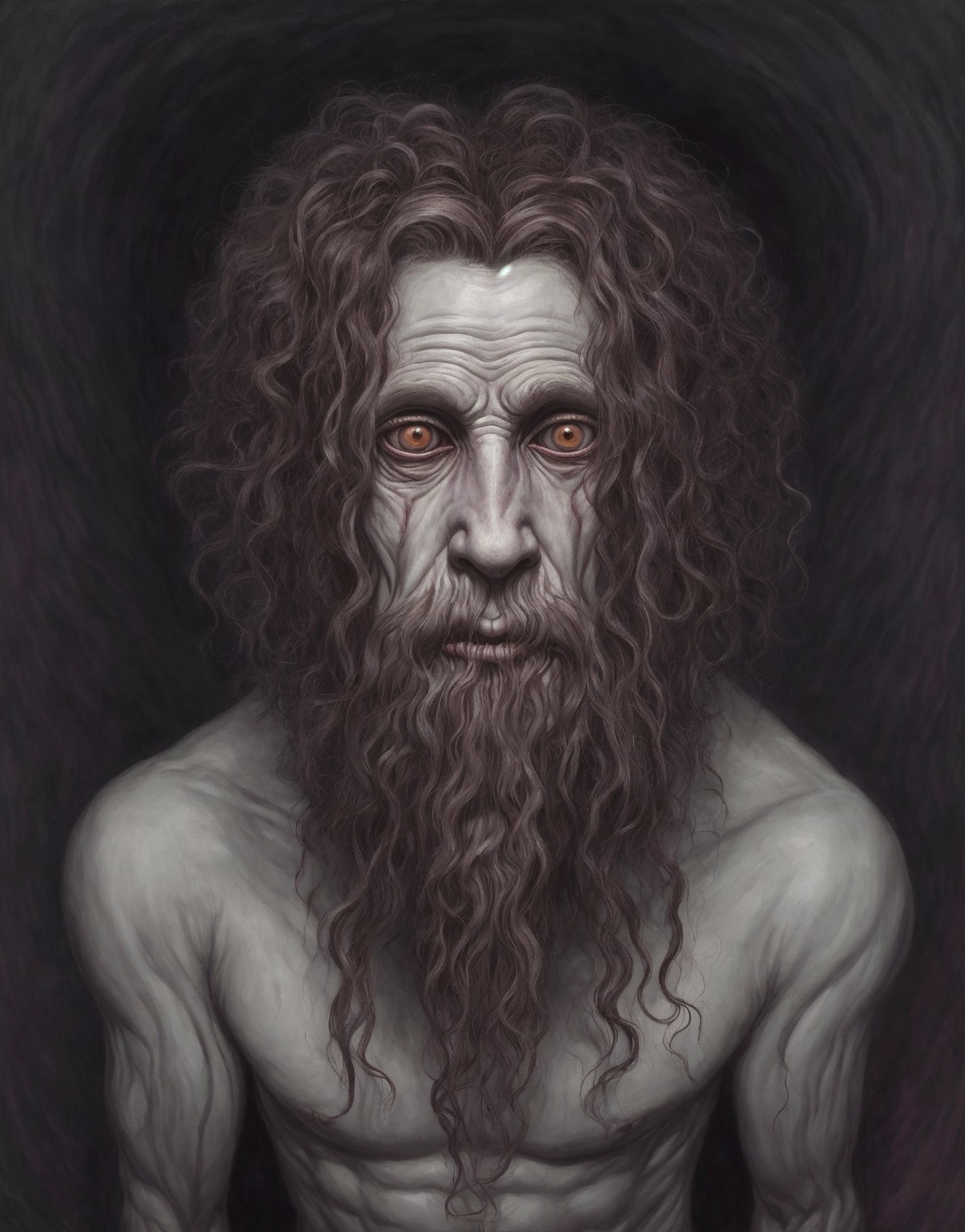 Intense portrait of a creature with wild curly hair, piercing yellow eyes, and a menacing gaze emerging from the darkness.