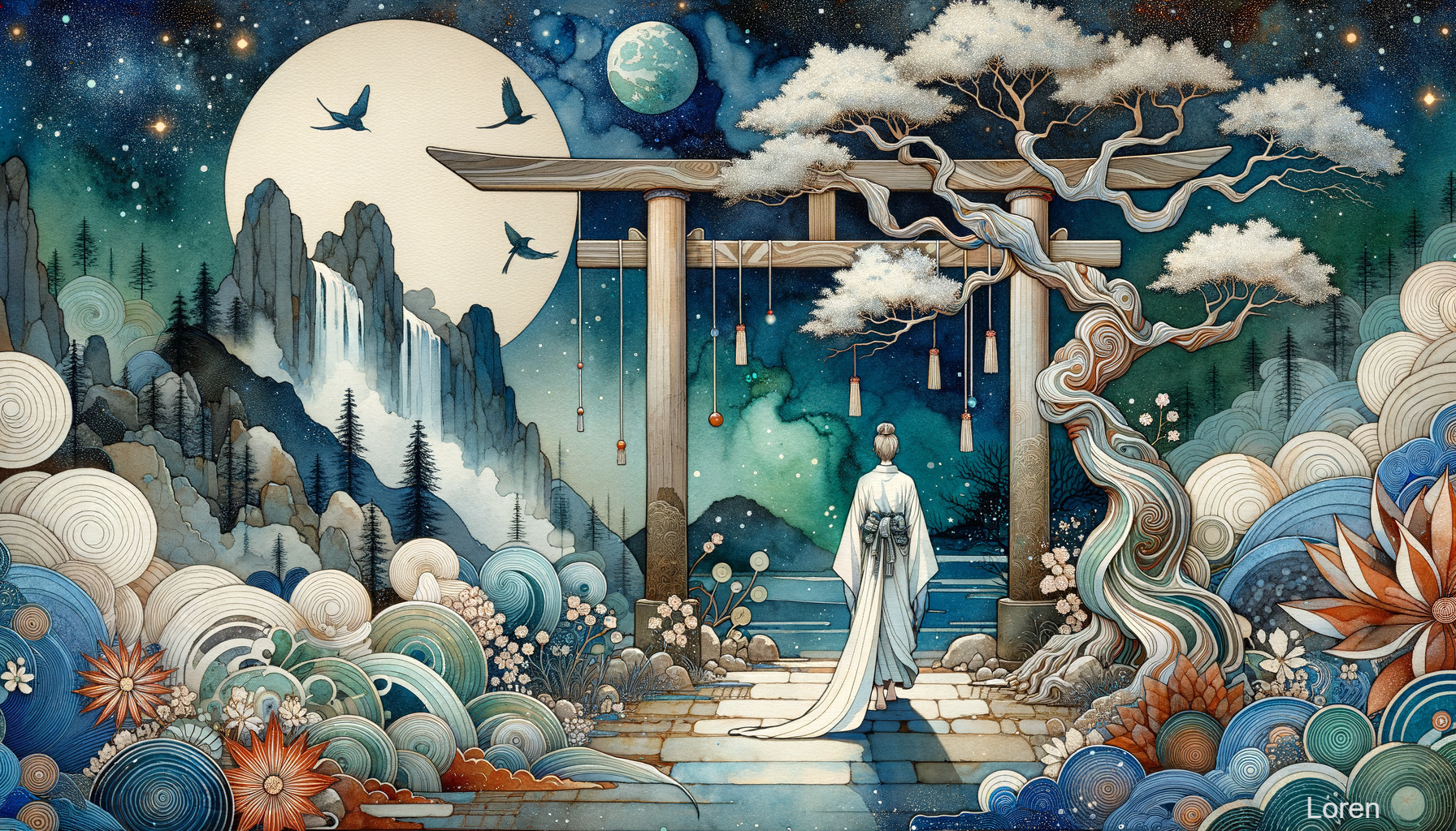 A stylized scene with a person under a moonlit sky, surrounded by mountains, trees, waterfalls, and flying birds, in a soothing, mystical palette.