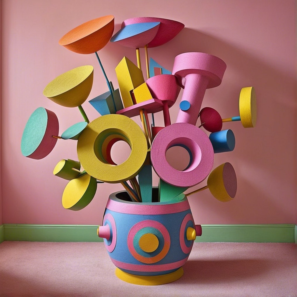 A vibrant, abstract sculpture composed of colorful geometric shapes and forms, resembling a bouquet of playful, oversized flowers in a stylized vase against a soft pink backdrop.