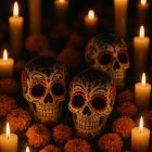 Two ornate skulls adorned with colorful designs sit among vibrant roses and flickering candles, creating a mystical atmosphere. The warm glow enhances the festive and celebratory vibe.