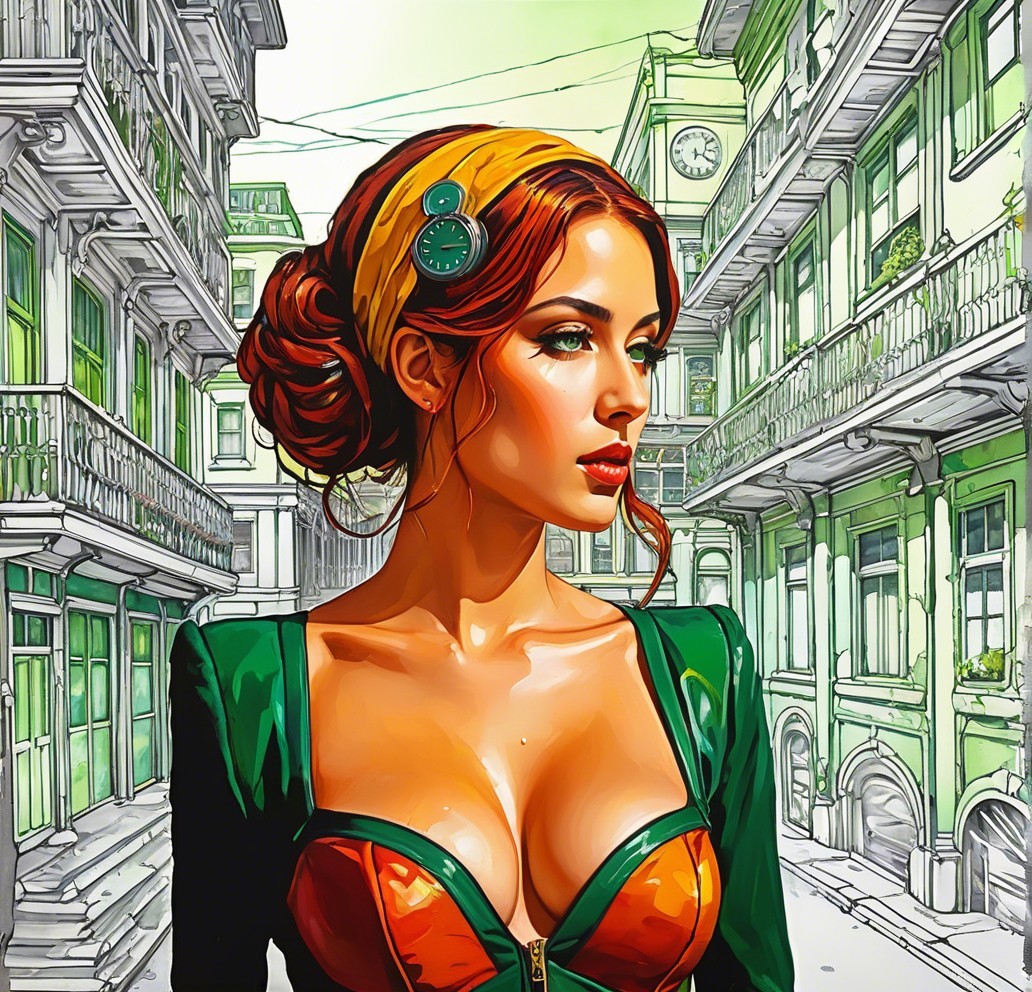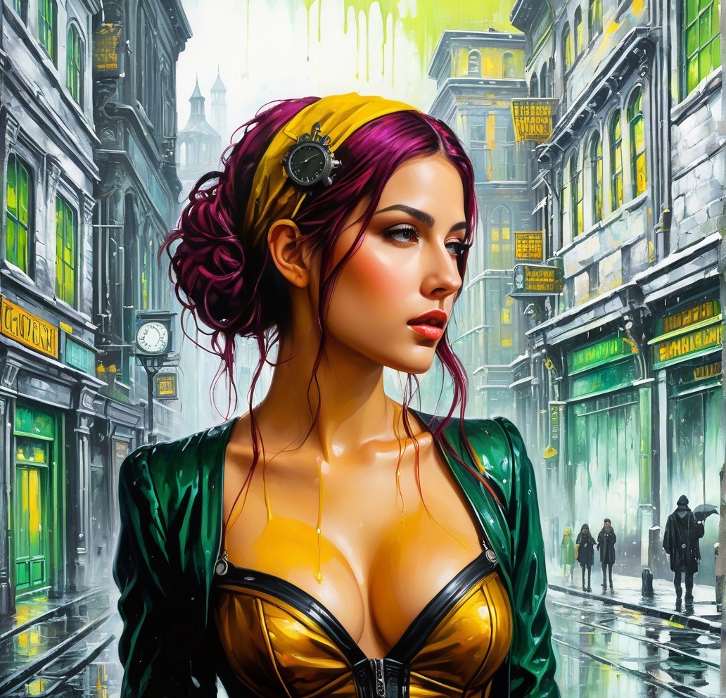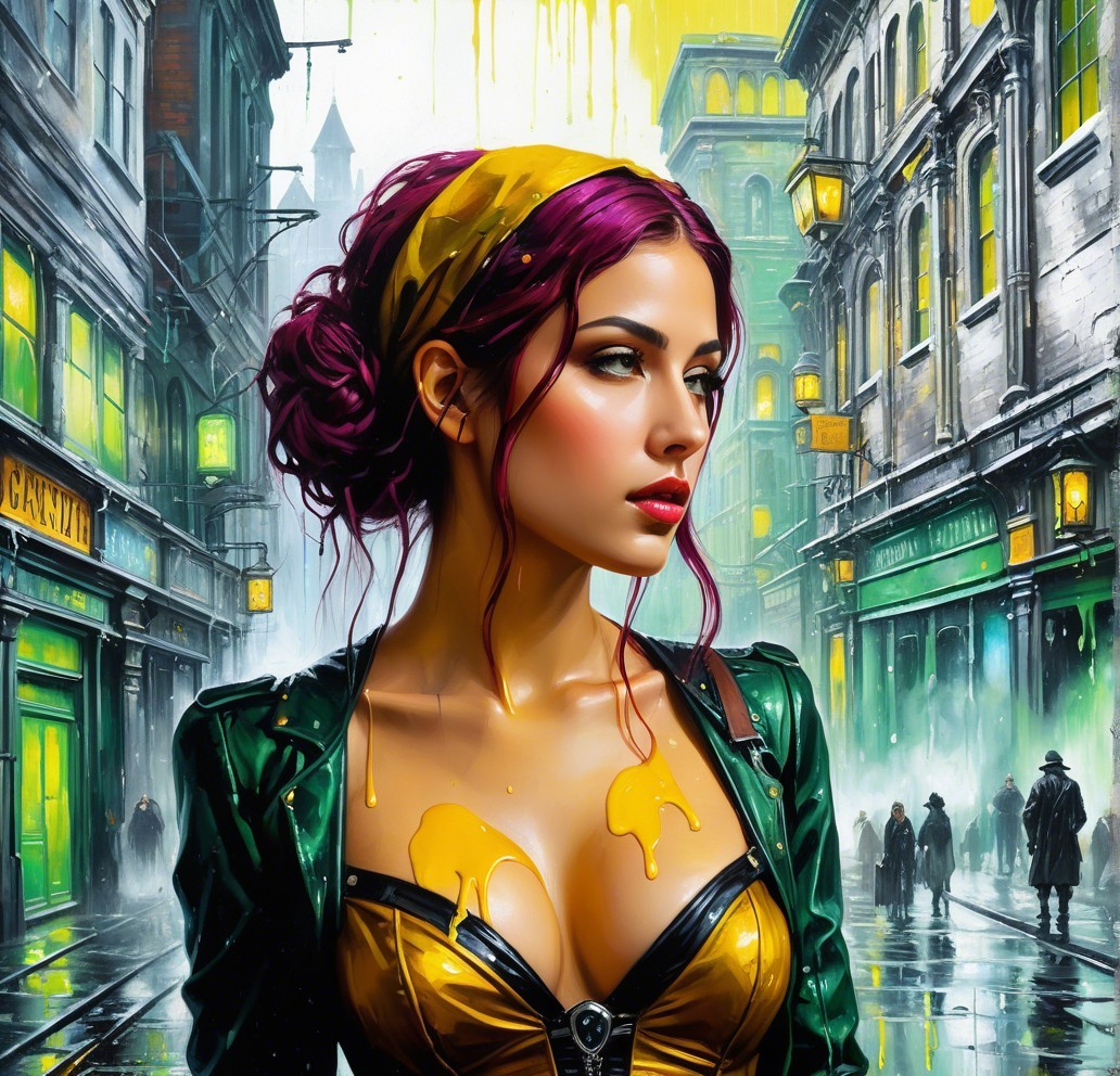 + Prompt:Clockpunk fantasy painting with a dark Gothic twist, utilizing a wet-on-wet technique. The artwork should feature intricate urban elements seamlessly integrated into a fantastical setting. Incorporate a blend of melting hues and peeling paint for a weathered look, enhancing the overall aesthetic with a pre-Raphaelite influence. Focus on a triadic color scheme of yellow, green, and red, complemented by burnt orange and sepia tones. Emphasize a hyperrealistic quality, with 3D effects and luminous plasticity. Merge aquatint with watercolor extrusion for a unique texture, subtle elements of grunge and soft eroticism, employing a splash ink technique with soft rounded edges. cel-shaded style, dof,blending retrofuturistic themes with a panavision aesthetic. Integrate folded paper references for added depth and visual interest. Explore a blend of earth tones and American Gothic influences, incorporating weathered textures for a vintage feel, ethereal vibe, featuring a beautiful woman's face in an Arcane GTNR style using watercolor and ink techniques. Enhance the image with HDR and VFX-inspired elements, incorporating a touch of auracore and xeroxed textures. Utilize a pencil and charcoal drawing style, merging it with suprematism for a unique visual impact. Focus on detailed linework and a high level of rendering quality.Experiment with a mix of auburn, sienna, burnt orange tones