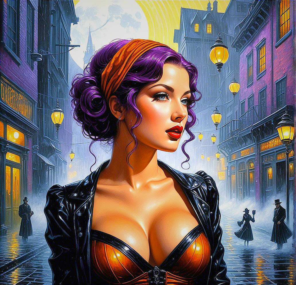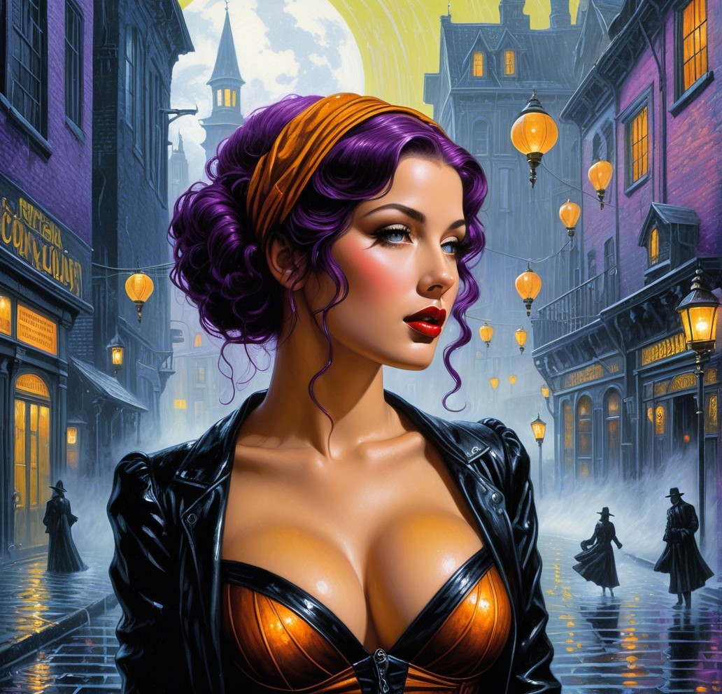 A glamorous woman with purple hair and an orange headband stands in a vibrant, moody street. The backdrop features vintage buildings, glowing streetlights, and a misty atmosphere.