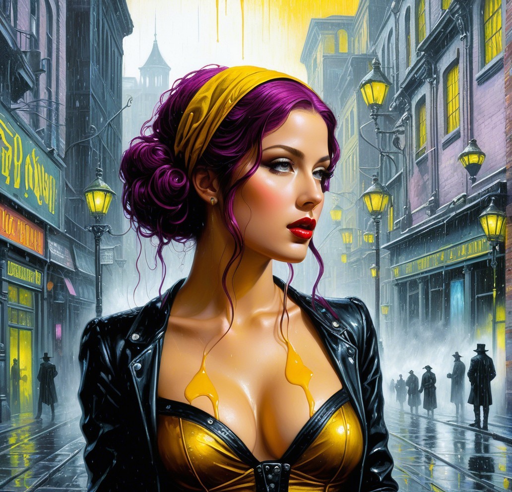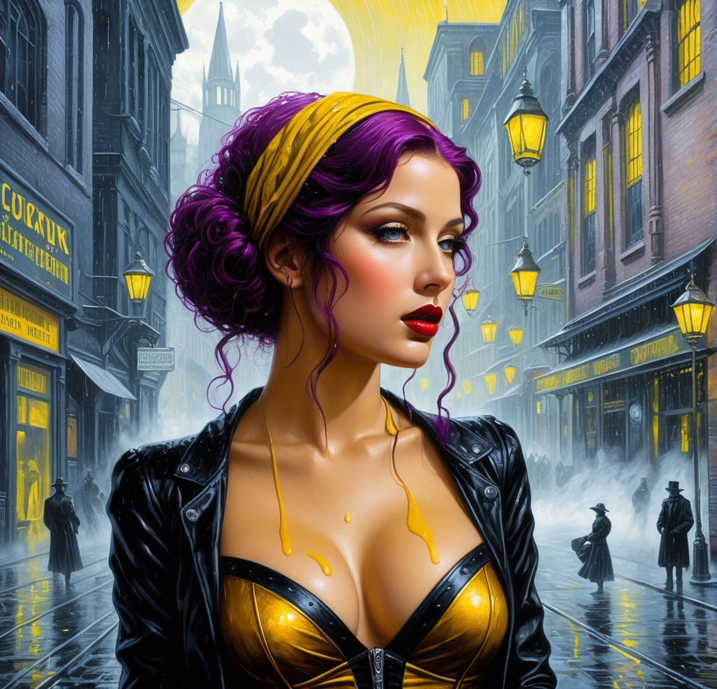 Prompt: Clockpunk fantasy painting by Virgil Finlay with a dark Gothic twist, utilizing a wet-on-wet technique. The artwork should feature intricate urban elements seamlessly integrated into a fantastical urban setting with vintage lanterns hanging from houses with a blend of melting hues and peeling paint for a weathered look, enhancing the overall grungy aesthetic with a pre-Raphaelite influence, triadic color scheme of yellow, purple, and grey, complemented by burnt orange and sepia tones.Focus on detailed linework and a high level of rendering quality. Experiment with a mix of auburn, sienna, burnt orange tones, great depth and scale. Stylized headshot, tesselated, sculpted, rim lighting, Vintage style, sqiggly brushstrokes, devilish eyes 1.7, fractal line patterns, flowing hair illusion, foampunk, reminiscent of expressionistic fractalization, splash ink technique, aquatint, black ink lines, watercolor effects, tesselated cottagegore 1.5, stylization 1.3, raytraced shadows 1.8 . Emphasize on hyperrealistic quality, with 3D effects and luminous plasticity. Merge grey aquatint with watercolor extrusion for a unique texture, soft dappled lighting, subtle elements of grunge and soft eroticism, employing a splash ink technique with soft rounded edges. cel-shaded style, dof,blending retrofuturistic details with a panavision aesthetic. Integrate folded paper references for added depth and visual interest. Explore a blend of earth tones and American Gothic influences and weathered textures for a vintage feel, ethereal vibe, featuring a beautiful woman's face in an Arcane GTNR style using watercolor and ink techniques. Enhance the image with HDR and VFX-inspired elements, a touch of auracore and xeroxed textures. Utilize a pencil and charcoal drawing style, merging it with suprematism for a unique visual impact. Hues by Ceccioli, tints by Paul corfield, overall composition by Norman rockwell.