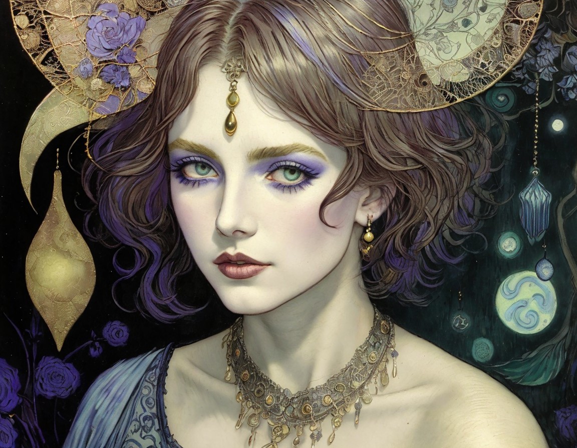 A digital artwork of a woman adorned with a floral and jeweled headpiece, set against a starry, midnight blue background.