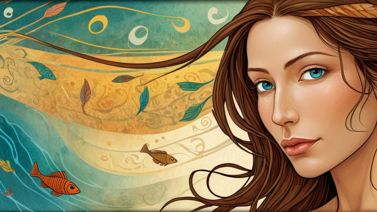 A digital painting of a woman with long, flowing brown hair covering the right side of the frame, facing left, with a light tan skin tone and striking clear blue eyes. She has a composed expression, with slightly parted lips and delicate lips that match her skin tone. Her hair, adorned with few