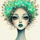 A stylized portrait of a young woman with large, expressive eyes and intricate floral hair. The vibrant greens and warm browns create a harmonious, nature-inspired aesthetic.