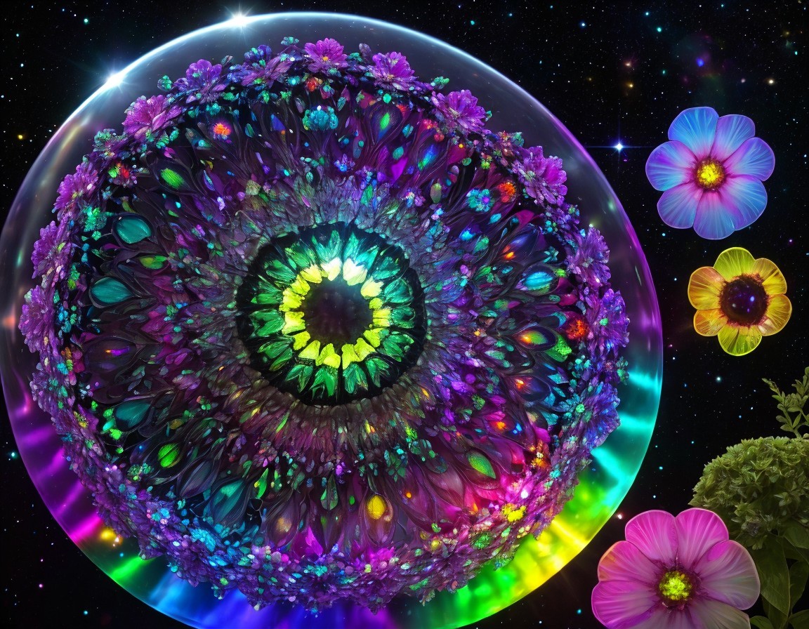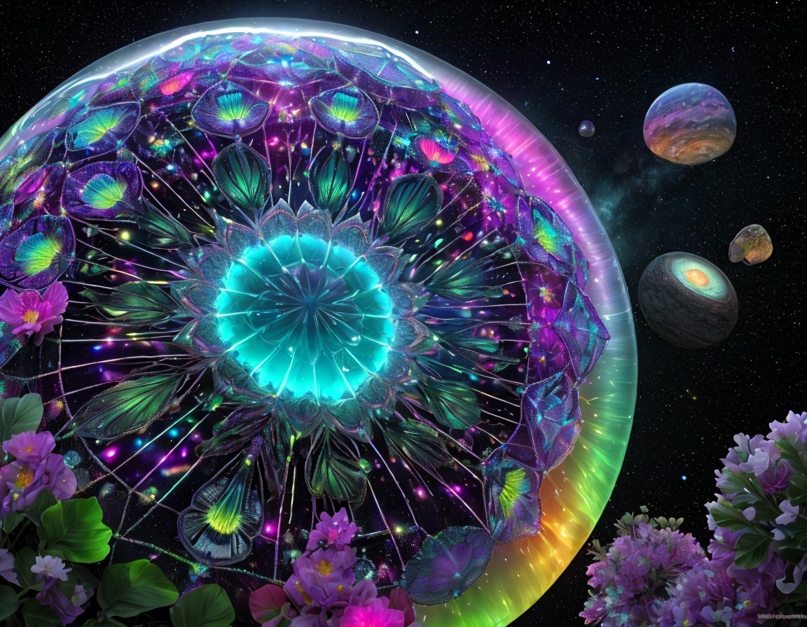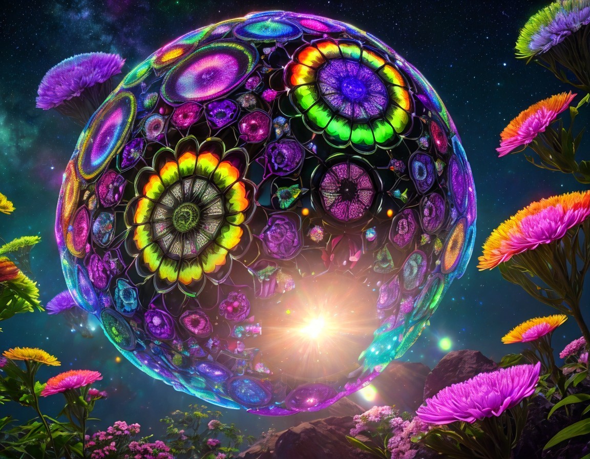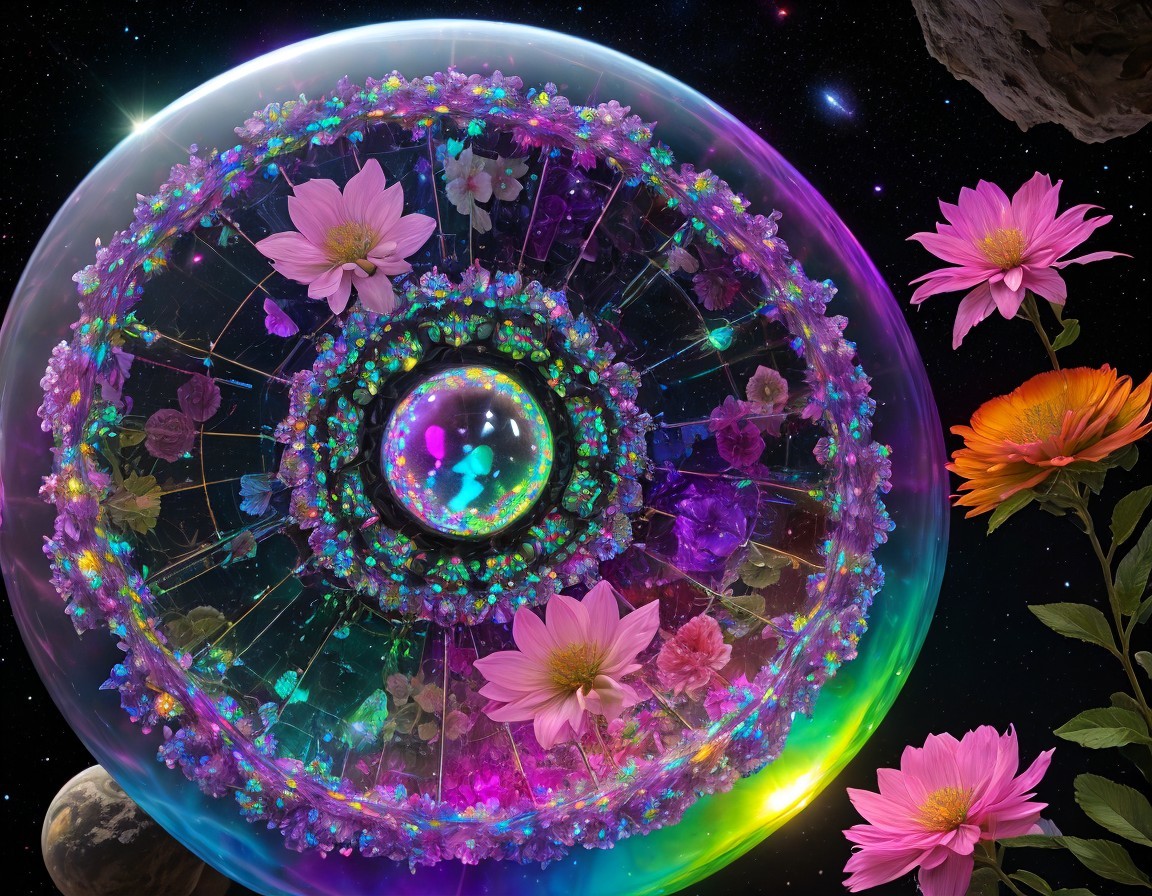 Prompt: An ultra-high-definition 3D enigmatic bright multicolored internally luminous transparent reflective intricately structured cellular biomorphic crystalline intelligent alien asteroid descends on a planet overflowing with strange mind-bending multicolored biologically complex blossoming plants of various unheard-of intricate whimsical transgalactic species that are completely unfamiliar look like no flowers from earth. With enhanced intense iridescence, opalescence, labradorescence and adularescence. Without ultra-bright light sources.