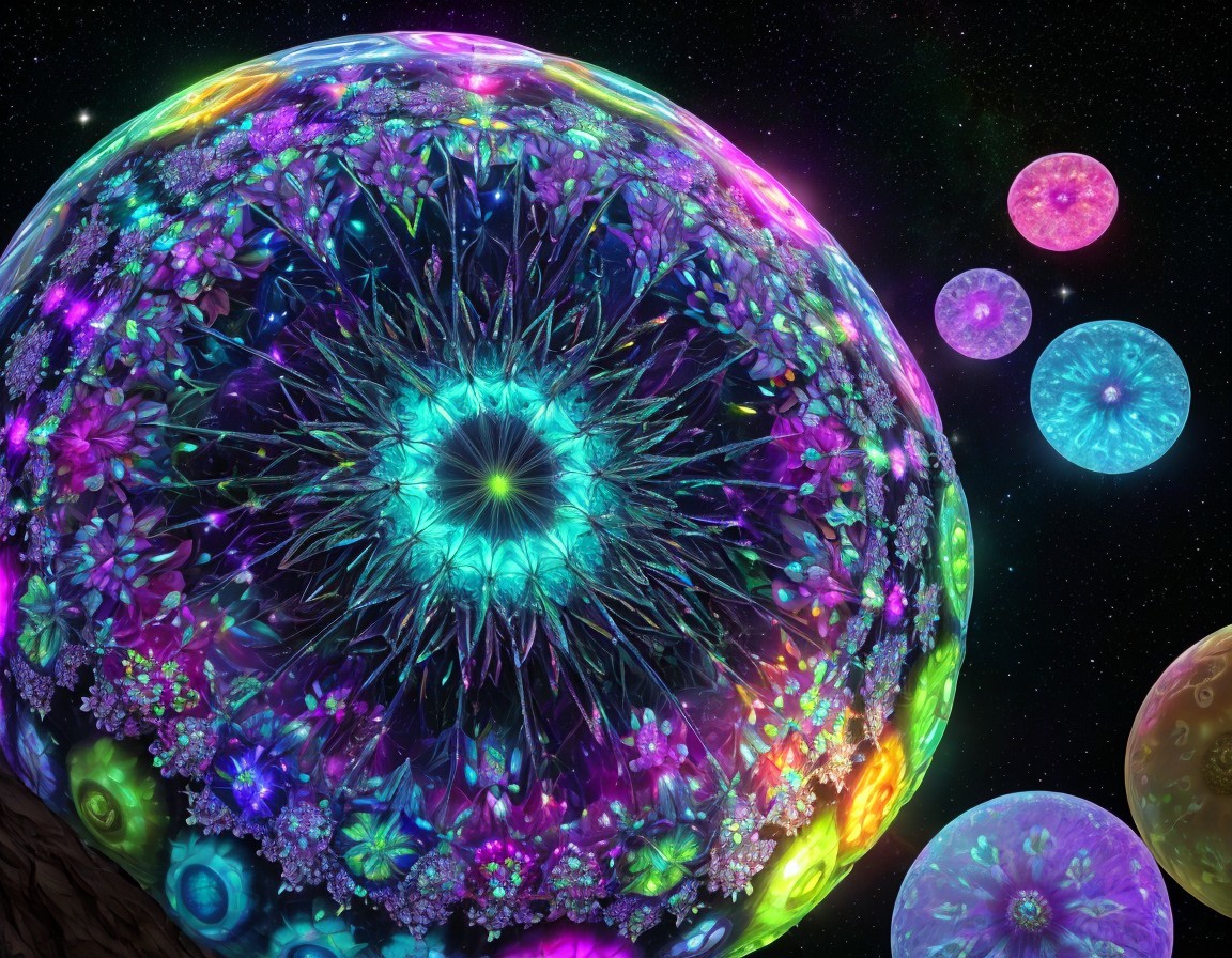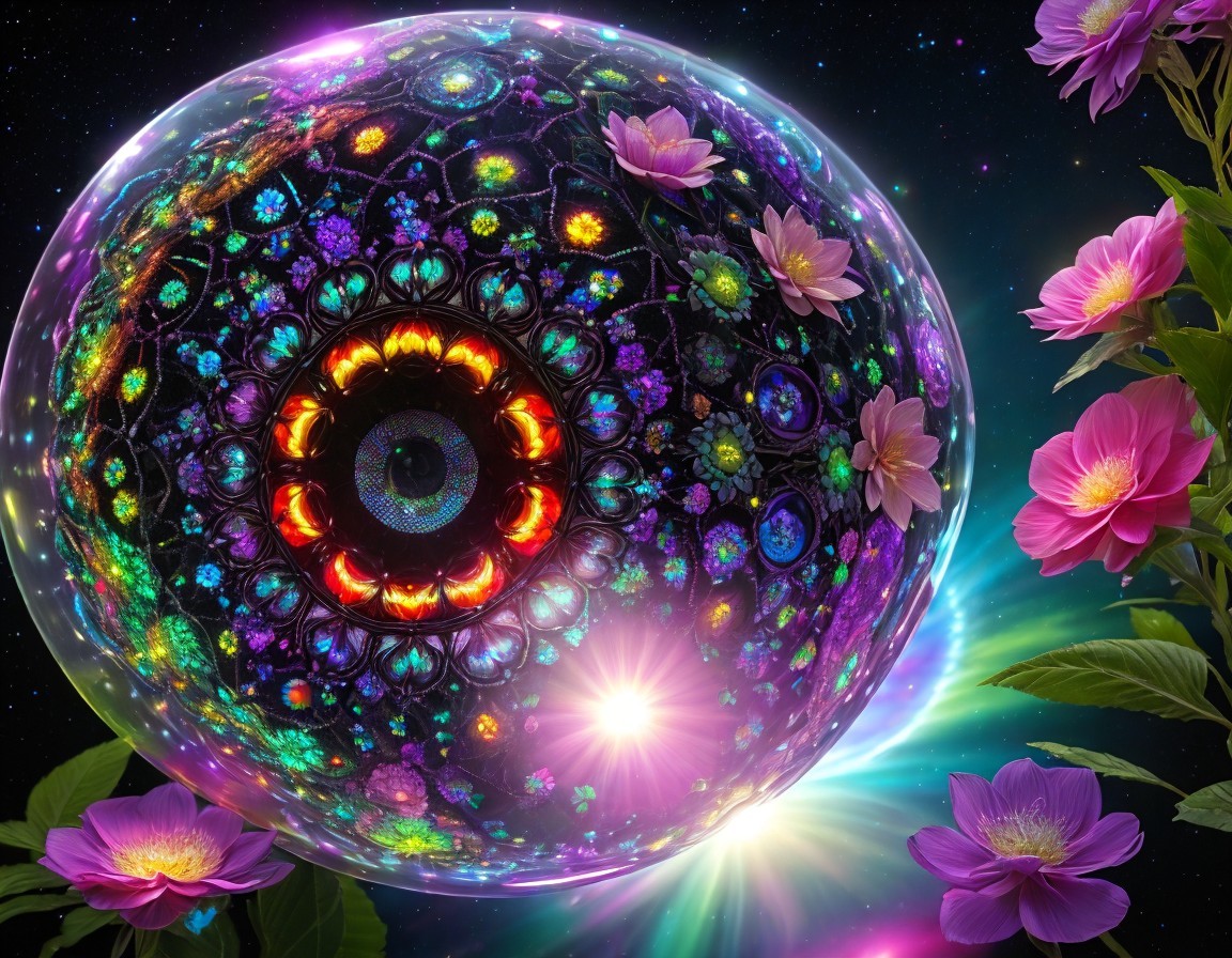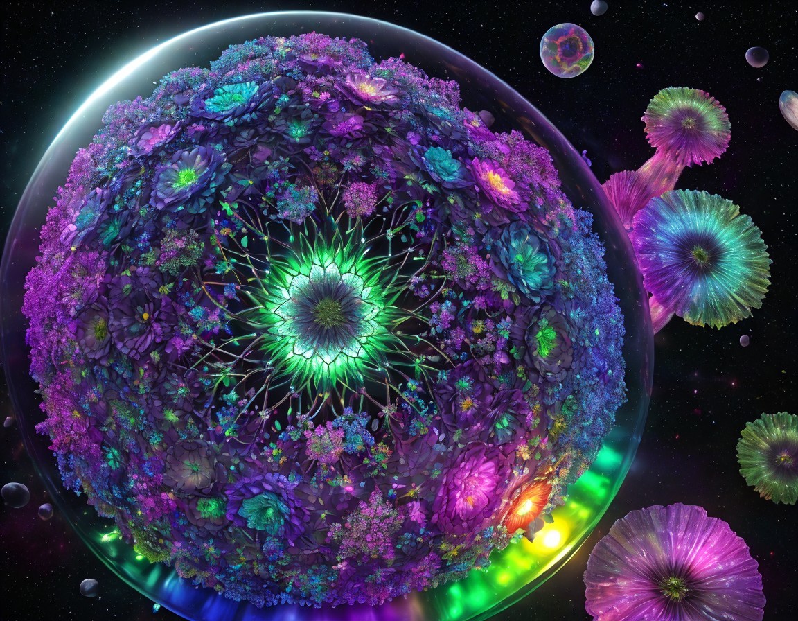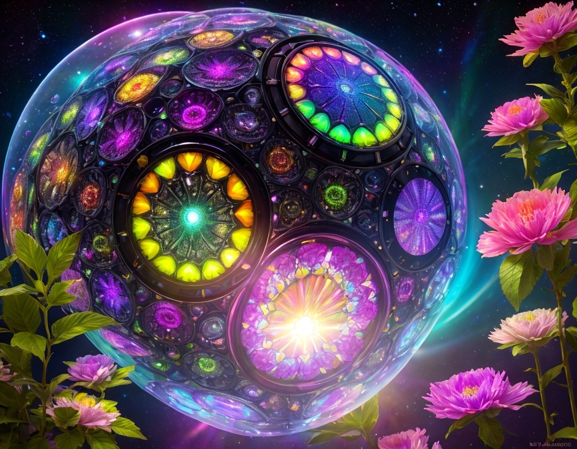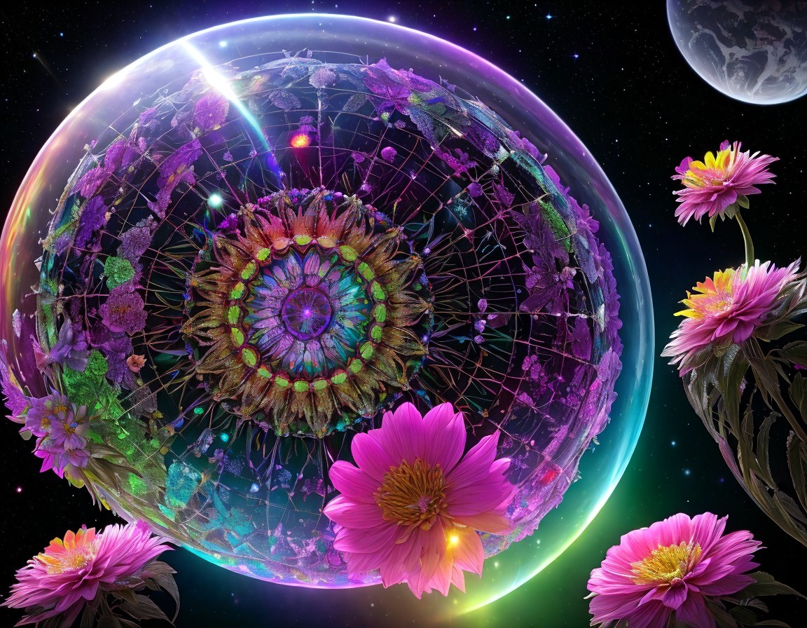 Prompt: An ultra-high-definition 3D enigmatic bright multicolored internally luminous transparent reflective intricately structured cellular biomorphic crystalline intelligent alien asteroid descends on a planet overflowing with strange mind-bending multicolored biologically complex blossoming plants of various unheard-of intricate whimsical transgalactic species that are completely unfamiliar look like no flowers from earth. With enhanced intense iridescence, opalescence, labradorescence and adularescence. Without ultra-bright light sources.