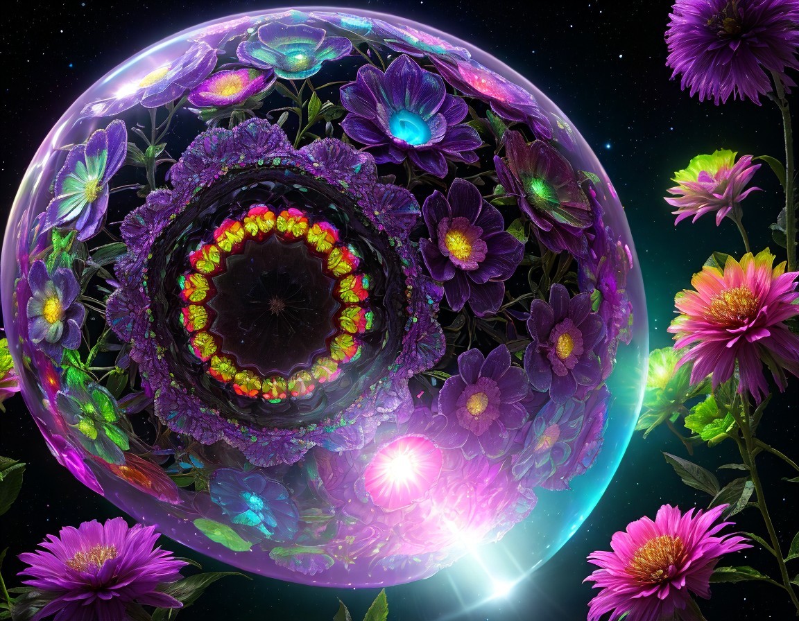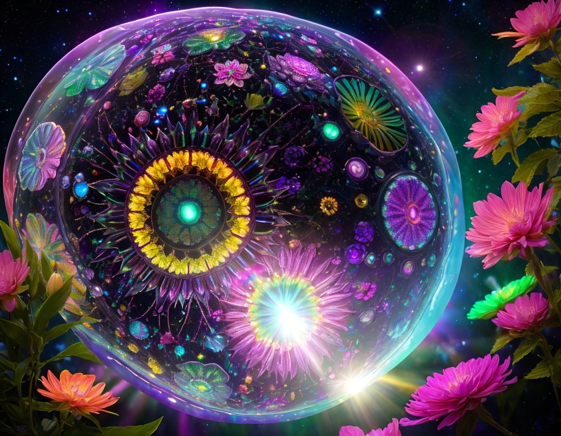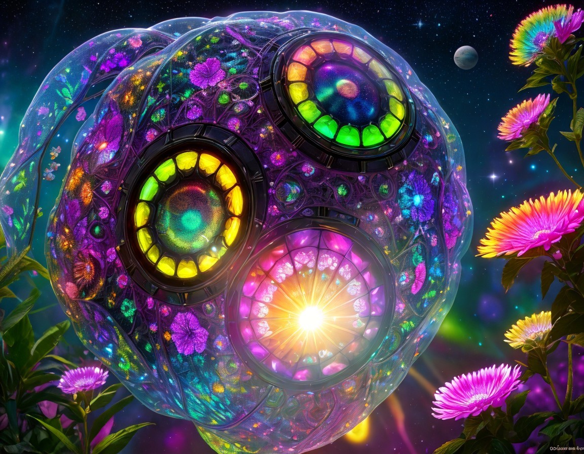 An ultra-high-definition 3D enigmatic bright multicolored internally luminous transparent reflective intricately structured cellular biomorphic crystalline intelligent alien asteroid descends on a planet overflowing with strange mind-bending multicolored biologically complex blossoming plants of various unheard-of intricate whimsical transgalactic species that are completely unfamiliar look like no flowers from earth. With enhanced intense iridescence, opalescence, labradorescence and adularescence. Without ultra-bright light sources.