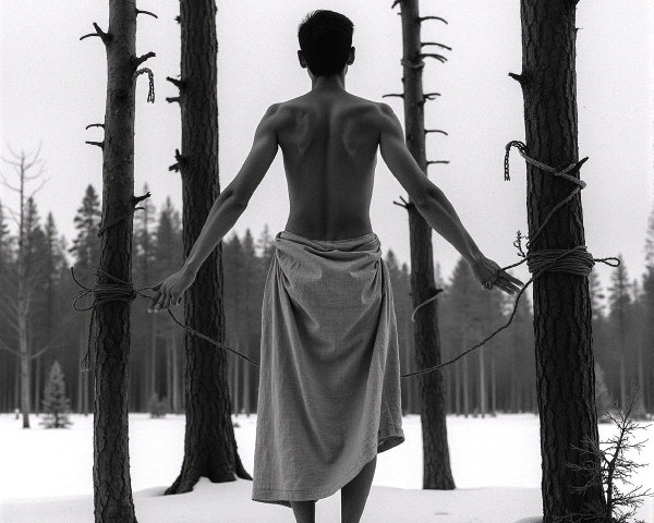 A full shot, black and white image, of a thin, muscular person with short hair, from behind, tied to two pine trees by a rope across their upper waist. The person is wearing a long skirt and is barefoot on a field of grass. Below their feet, a symbol is drawn on