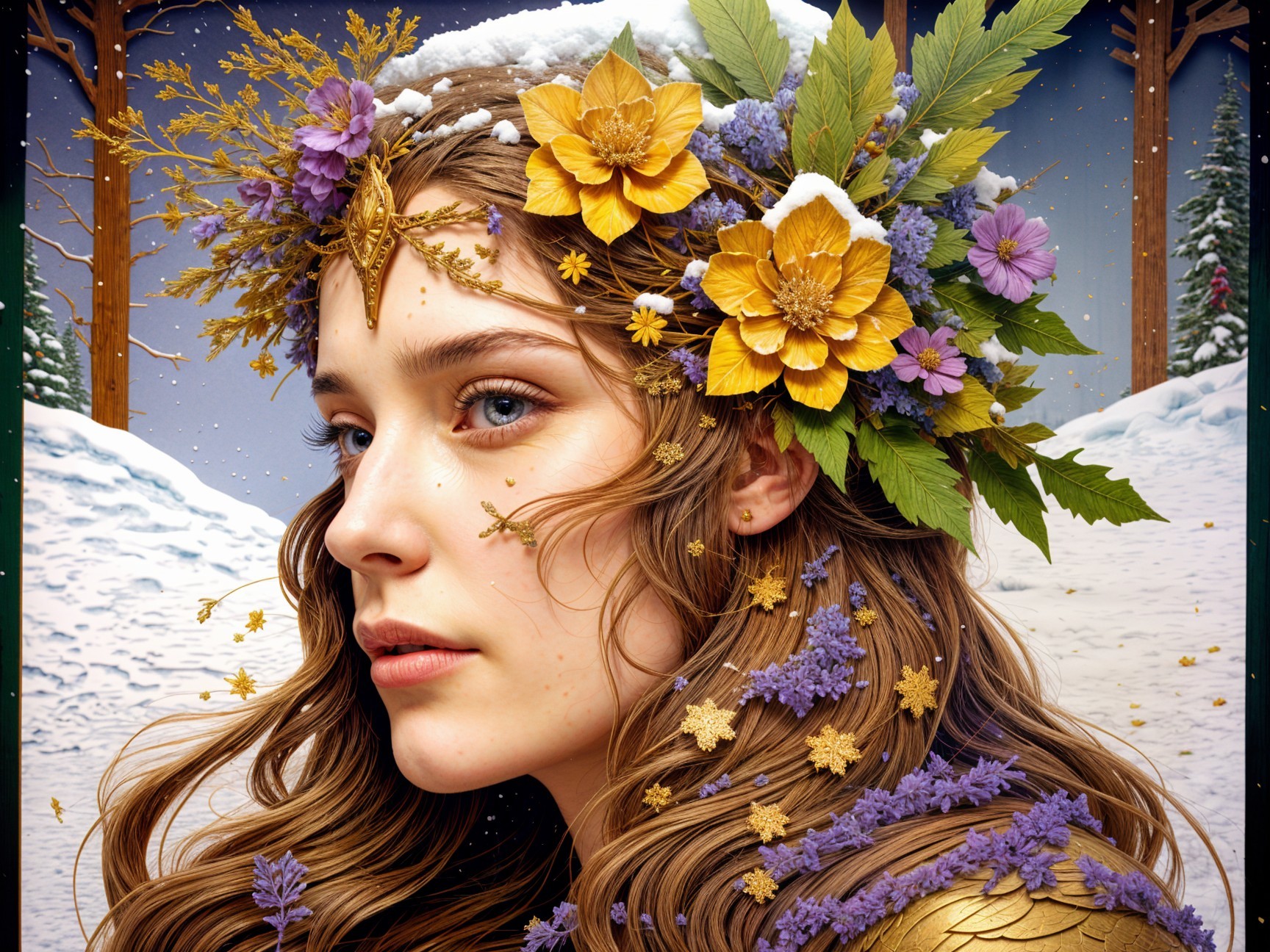 A serene winter scene featuring a young woman with flowing hair adorned with a leaf crown, gazing thoughtfully towards a snowy landscape with mountains in the background. Snowflakes gently fall around her.