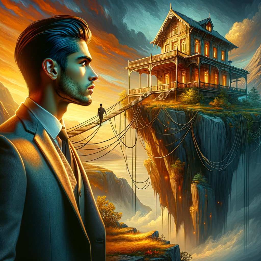 Prompt: "he saw steel cables and a house on the edge of cliff. The trusty cables that had held strong for four generations. House with suicidal tendencies-his friend had call it,dramatic, watercolour in silk, style by Thomas Wells Schaller, Maxfield Parrish and Ivan Bilibin, vibrant colours, intricate, magical, elegant, beautiful, colourful, bioluminescent highlights and atmosphere, crisp quality, Daniel Merriam art station"