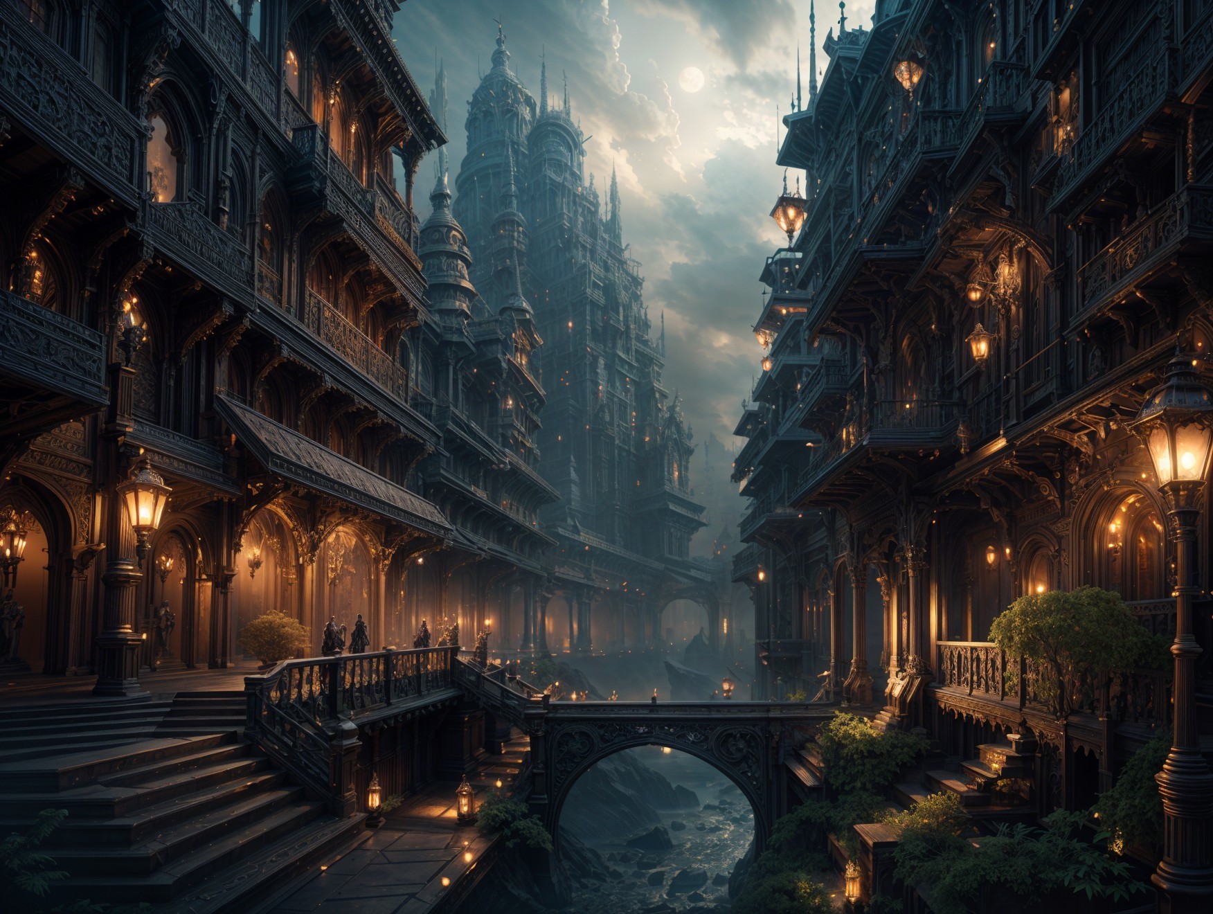 A mystical cityscape featuring ornate, dark wooden buildings with intricate designs. Soft light from lanterns illuminates the scene, while towering mountains loom in the background under a moody sky.