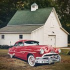 A vibrant red vintage car parked beside a classic white barn. The car features chrome accents and whitewall tires, set against a backdrop of green grass and a lush, overcast sky.