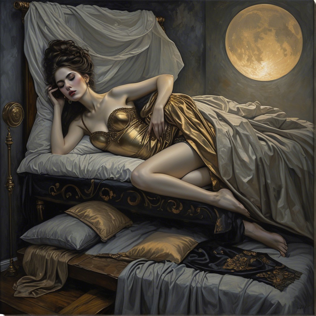 A woman in a flowing gold dress reclines on a bed with soft linens, set in a dimly lit room. The warm glow from a nearby lamp enhances the intimate atmosphere, creating a serene mood.