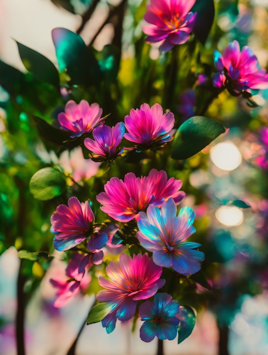 Vibrant purple and pink flowers with yellow centers, surrounded by green leaves in soft-focus background.