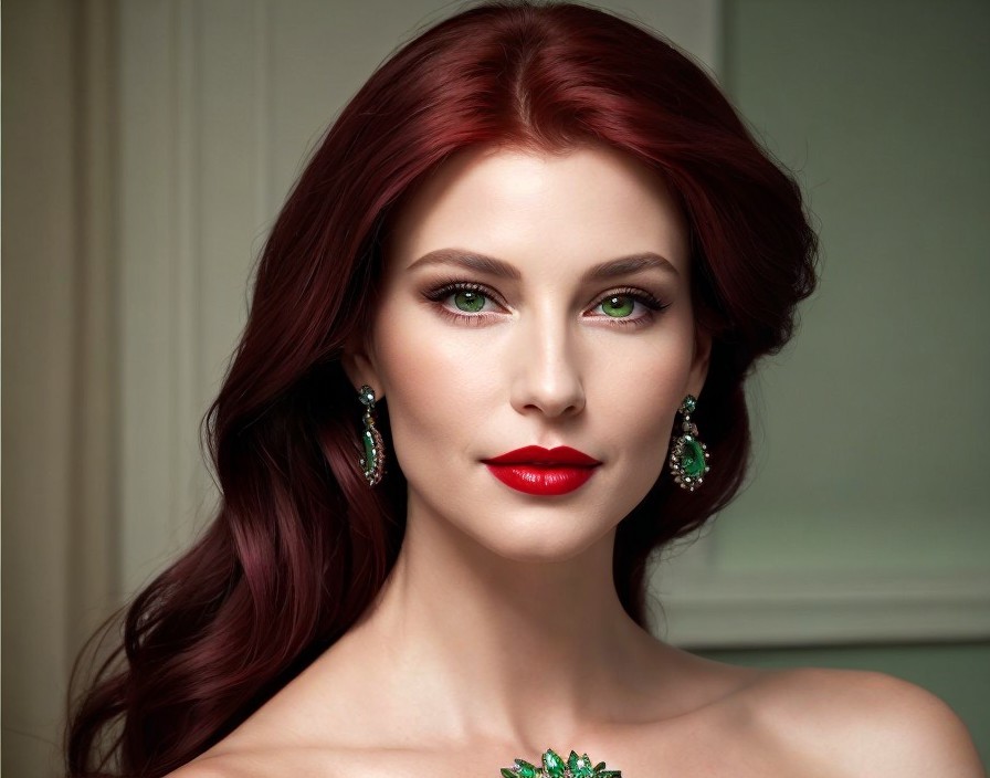 A woman with vibrant red hair, green eyes, and red lipstick, wearing green gemstone earrings and a necklace.
