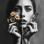 A striking black-and-white portrait of a woman. One side features daisy flowers, while the other holds a vintage camera, emphasizing contrasts between beauty and melancholy.