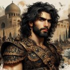 Portrait of a Persian nobleman; Persian male attire black and gold detailed long curly hair brown eyes bushy beard tall muscular build; and a beautiful palace...