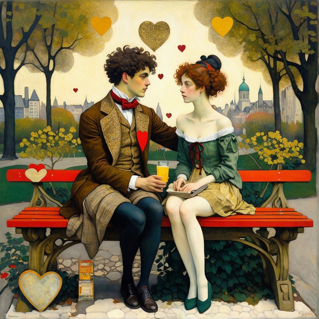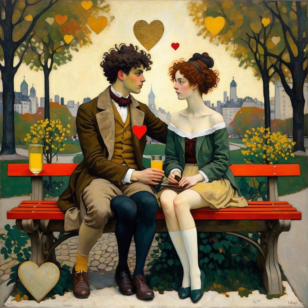 A young couple sits on a red park bench, wrapped in an intimate Valentine’s Day moment. The man, in a vintage brown suit, leans in with a bouquet of pink flowers, his gaze filled with affection. The woman, dressed in an elegant green jacket and cream skirt, looks back at him with warmth. Floating hearts above them symbolize the unspoken emotions between them. The soft city skyline, blooming shrubs, and gentle light set a scene of timeless romance.