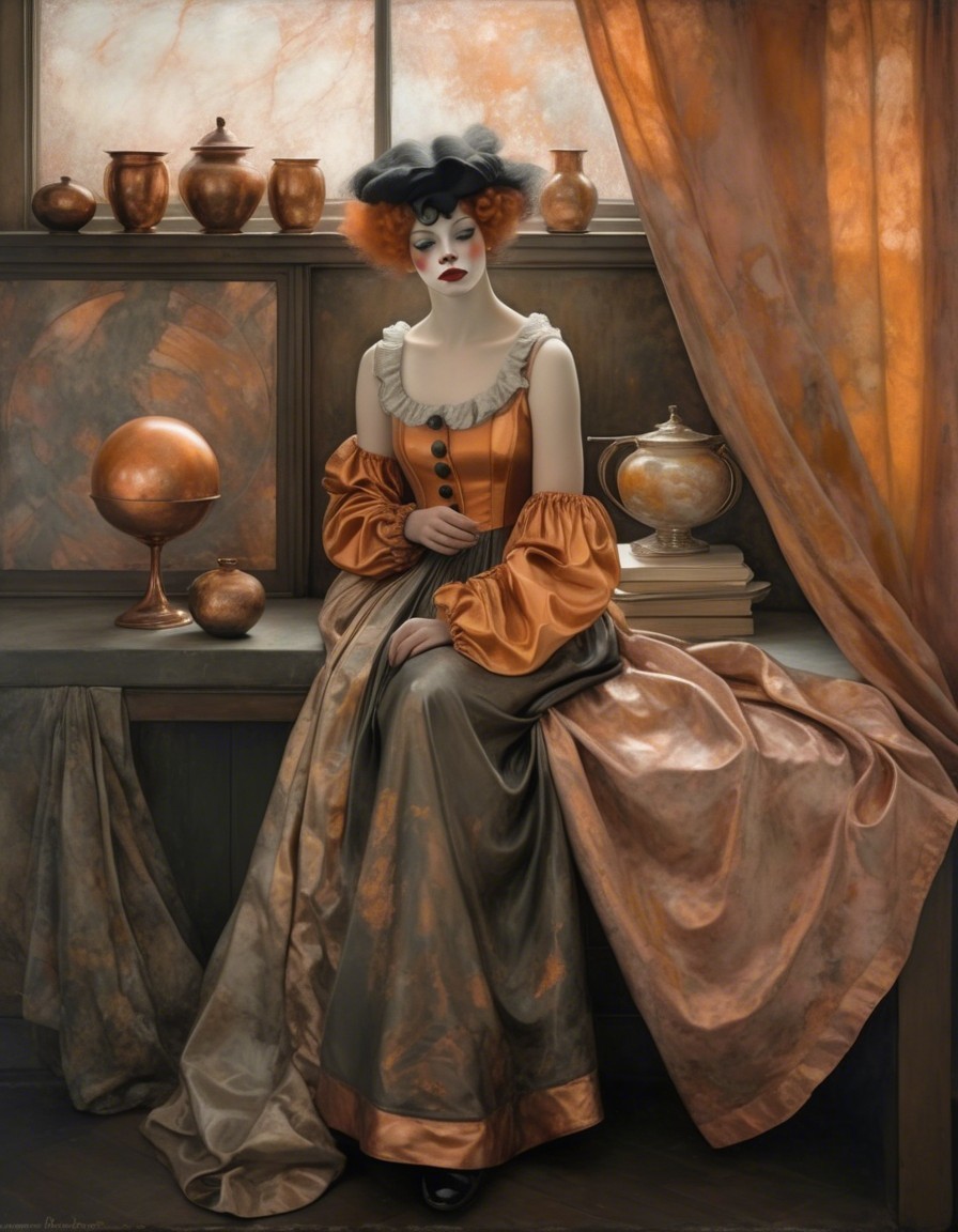Prompt: The sad girl clown, Velvet blush copper, peach Shabby, Dull Gold, Amber Gray, marbled. dramatic