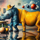 A whimsical scene features a rhino in a yellow outfit and a blue hat, interacting with a chair while colorful spheres float around. The surreal background enhances the playful atmosphere.