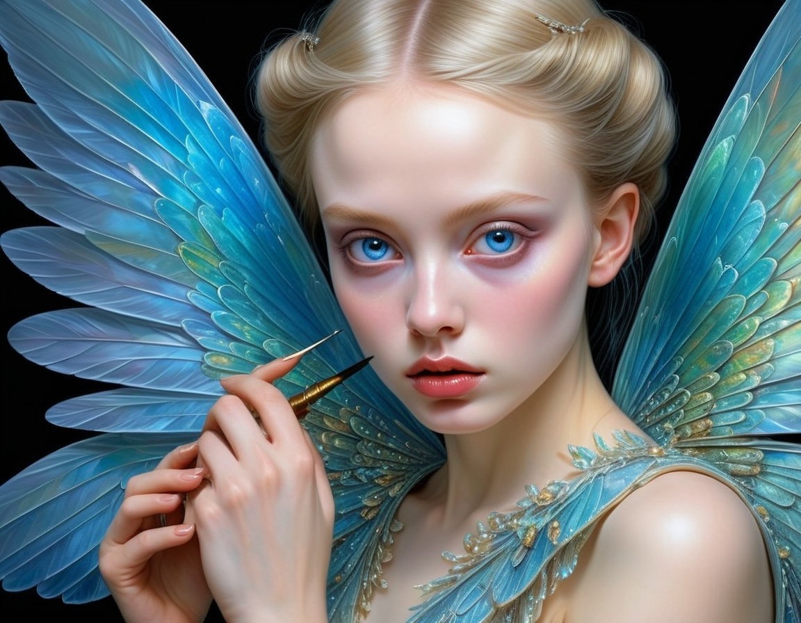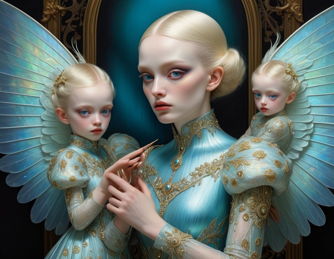 brush oil on canvas, opalescent and iridescent colors, multiple moire patterns, ib 3D, Surrealism, Here again the crossroads lurks a dusty flower, overlaying transparent layers, engraving texture, muted metallic shades, gradient light transitions, rounded lines, slow but tense movements.Create an image of a mysterious character with a haunting appearance, featuring a face that exhibits a blend of beauty and horror. The skin should be a deep gray with intricate, worn patterns resembling **dry cracked earth**, evoking a desiccated and ancient texture. The character has sunken cheeks and a pronounced jawline, reminiscent of skeletal features. Their eyes are strikingly dark with a hint of gold, giving an eerie glow, and the expression is one of fierce intensity. The hair is long, dark, and somewhat wild, with **velvety sand texture** subtly woven throughout, adding softness to the otherwise rough and ominous look. Elements of embellishment, such as earth tones, small skulls, and natural materials, are tangled in the hair.The character wears elaborate jewelry, including a thick, ornate necklace made of dark beads with **metal surfaces covered in patina**, giving a worn, time-weathered appearance. Additional accessories, like bracelets and rings, display **rust on metal**, further emphasizing the ancient, ritualistic aesthetic. Surrounding the character is a dark, smoky background, layered with **volcanic ash** and faintly shimmering **frosty mist**. These atmospheric elements enhance the sense of an otherworldly presence. Faint, glowing embers or mystical energy radiate from the character, especially around the face and shoulders, with hints of **shattered glass-like** reflections that add to the sense of danger and intrigue. Their eyes, glowing faintly with **mercury metallic shine**, give off a surreal, almost hypnotic glow. The overall tone should be dark and immersive, evoking a sense of ancient rituals and deep spiritual Designed by GoBi