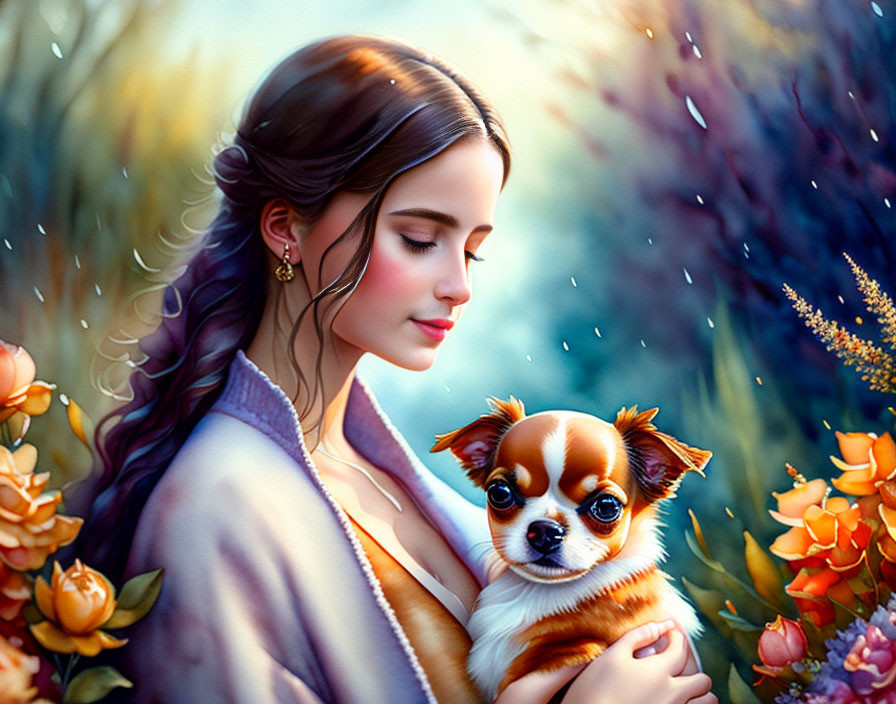 Prompt: watercolor illustration of Aaron Blaise, beautiful young woman holding a little cute chihuahua, warm, subdued colors, wet on wet watercolor technique, panoramic view