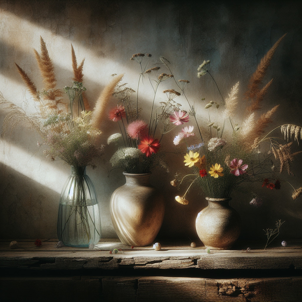 A collection of various summer flowers elegantly arranged in glass and ceramic vases. Soft, natural light highlights their delicate colors and textures against a rustic backdrop.