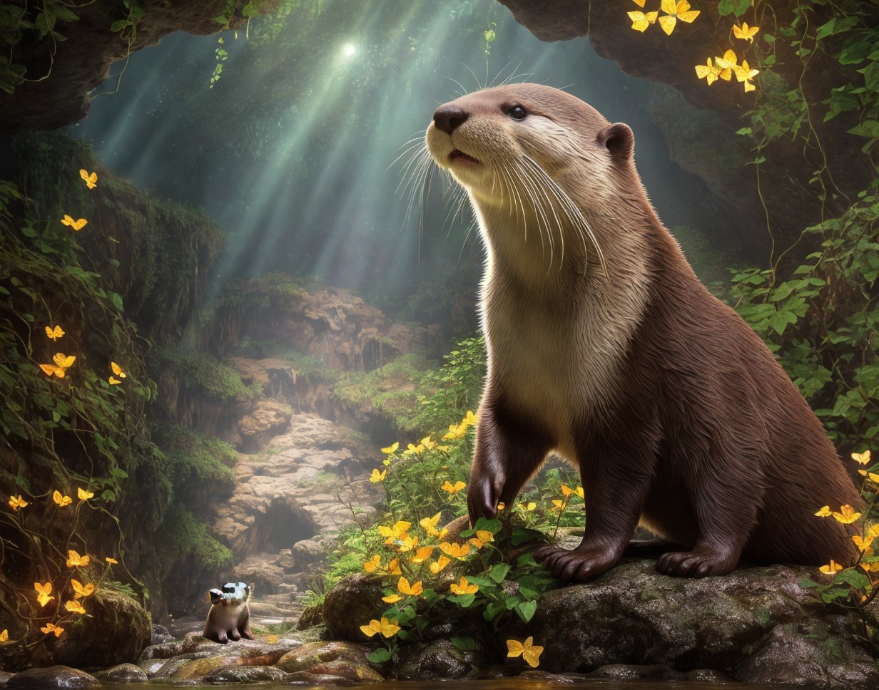 Two otters on a rock surrounded by foliage and butterflies, with sunbeams filtering through the trees above.