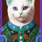 A regal white cat with striking blue eyes and blue-tipped ears dons a colorful, ornate garment featuring floral patterns. The background is rich and vibrant, enhancing the cat's majestic presence.
