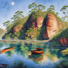 A tranquil river scene features vibrant orange and green rocky cliffs reflected in calm waters. Two boats rest peacefully, surrounded by lush greenery and a clear blue sky with soft clouds.