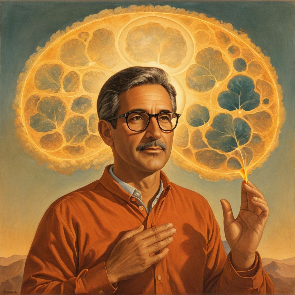 A man in an orange shirt and glasses stands confidently, gesturing thoughtfully. Above him, a vibrant cosmos filled with bubbles and celestial bodies reflects his contemplative nature and curiosity.