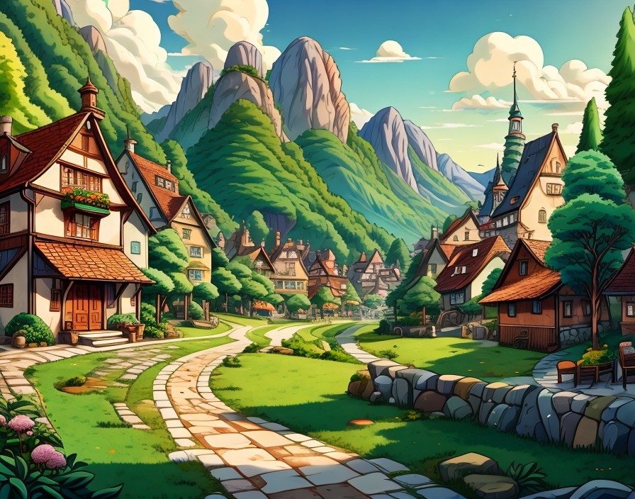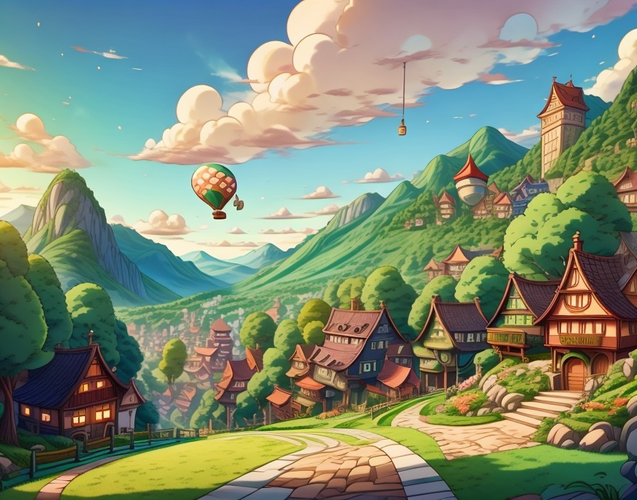 A picturesque village with quaint houses amidst lush greenery, mountains in the background, under a sky with a colorful hot air balloon.