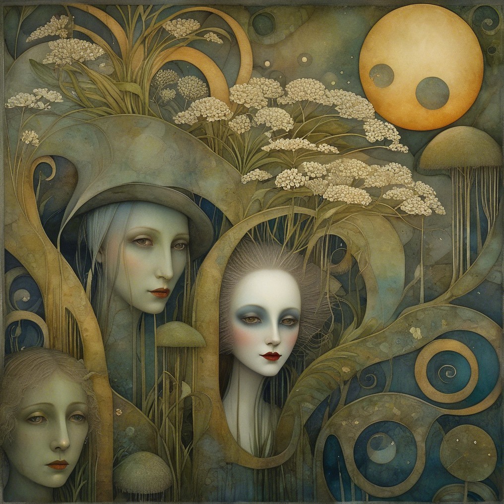 A surreal portrait of a pale figure with vibrant green hair, emerging from a tranquil pond surrounded by lily pads and delicate flowers, exuding an ethereal and mystical atmosphere.