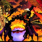 A dramatic scene featuring fierce, mythical beasts in a fiery setting. The monsters, with vivid colors and fierce expressions, display intense energy amidst swirling flames and dark clouds.