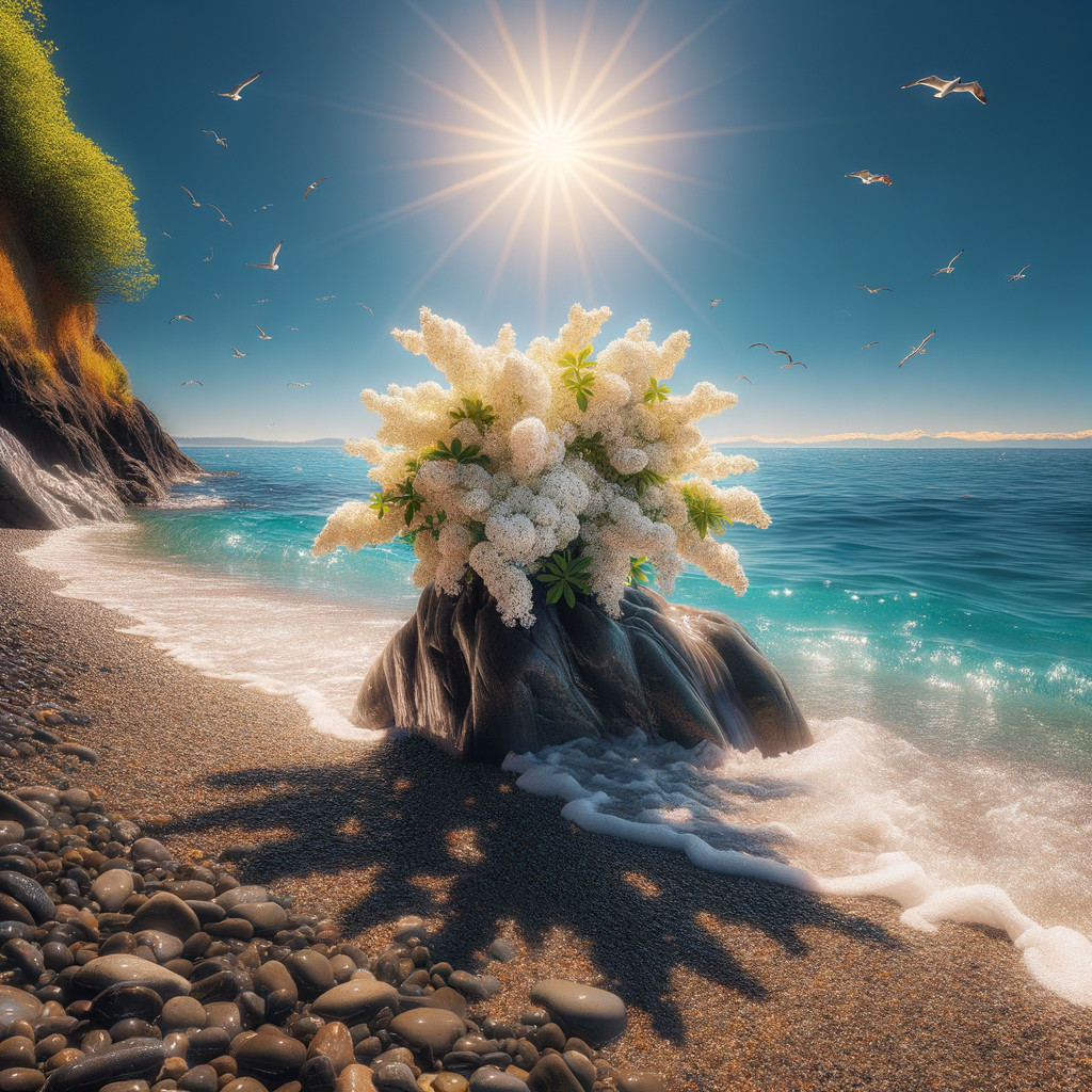 A serene beach scene features gentle waves lapping at the shore, scattered rocks, and seagulls soaring above against a backdrop of mountains and a clear blue sky.