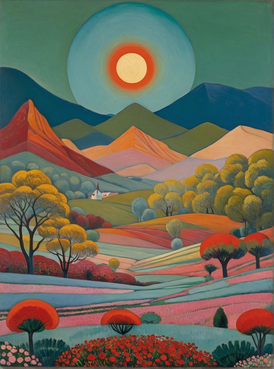 A vibrant landscape features rolling hills and colorful fields, with a large sun and layered mountains in the background, creating a whimsical and harmonious scene.