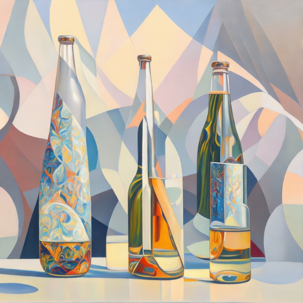 Three colorful, intricately patterned bottles against an abstract, geometric background with warm hues.