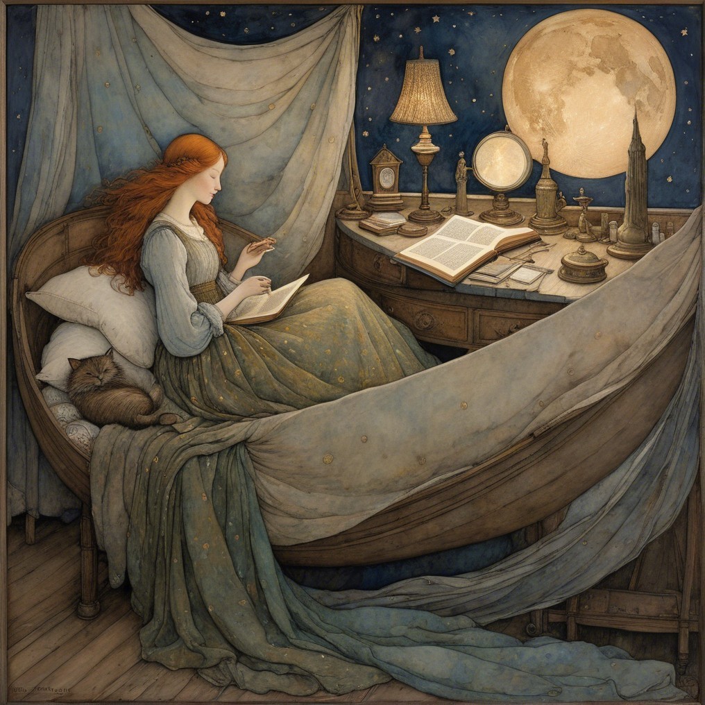 A serene scene featuring a young woman in a flowing blue dress, reading on a wooden boat bed. The night sky sparkles with stars and a large moon, creating a dreamy, enchanting atmosphere.
