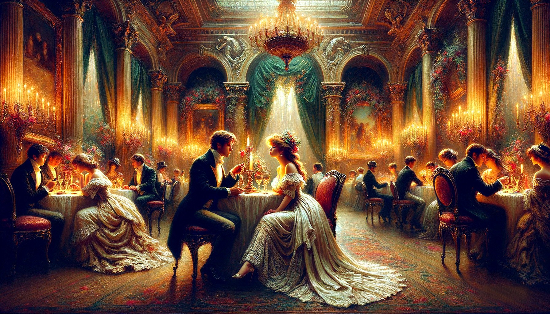 An opulent banquet hall with elegantly dressed guests seated at tables, conversing under warm, ambient lighting.