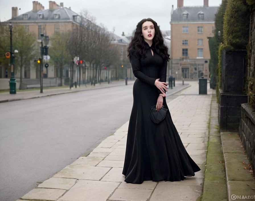 A woman with long flowing hair in a flowing black and cream dress striding confidently down an old city street.