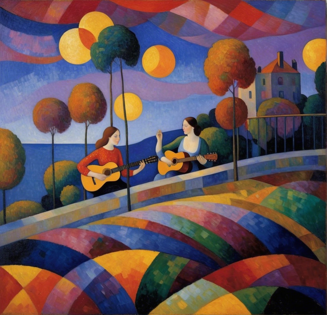 The artwork features three women playing guitars and a violin, surrounded by a colorful landscape with rolling hills, stylized trees, and a vibrant sky illuminated by large orange suns.