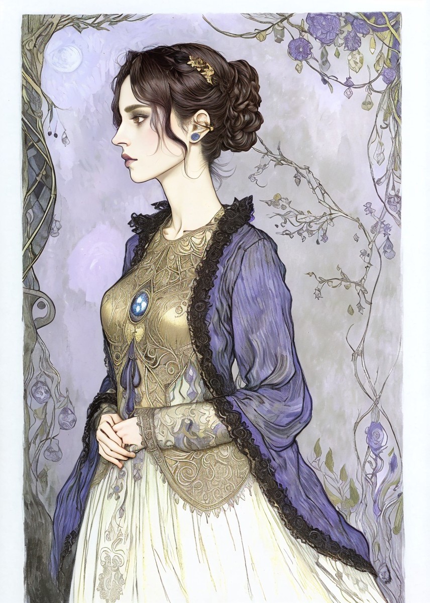 An illustration of an elegant woman in a vintage dress with flowers in her hair, surrounded by a floral motif.