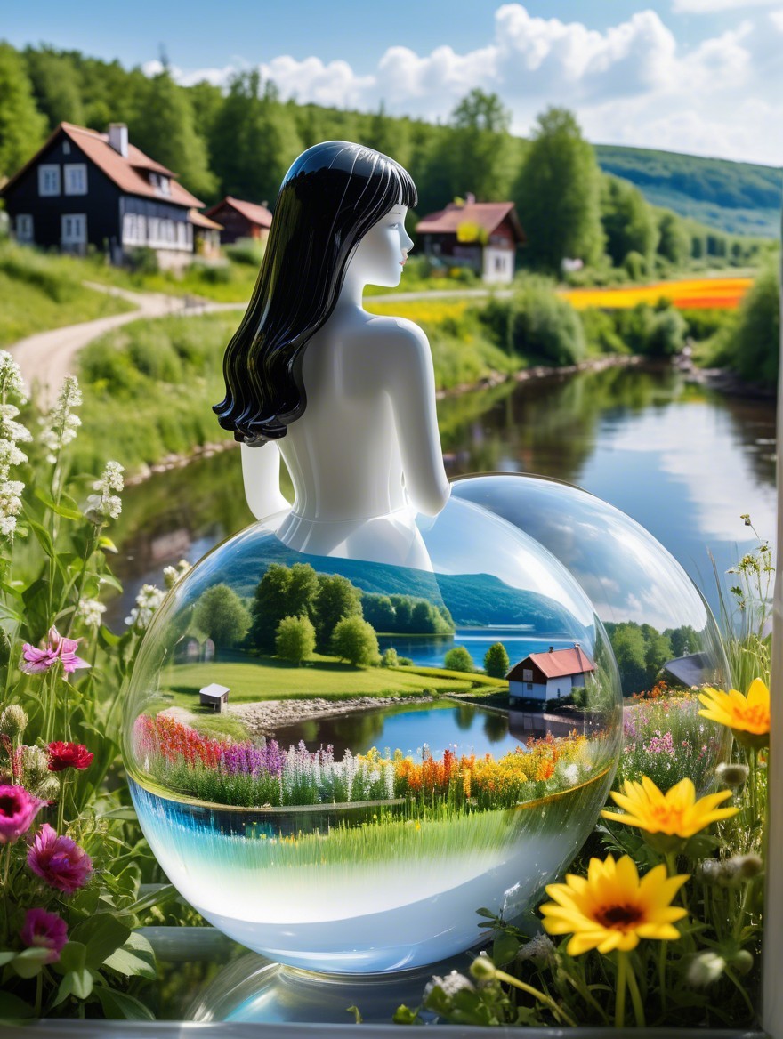 A glossy, stylized mannequin stands by a serene pond surrounded by wildflowers. Colorful houses dot the lush green landscape under a bright blue sky, creating a whimsical, picturesque scene.