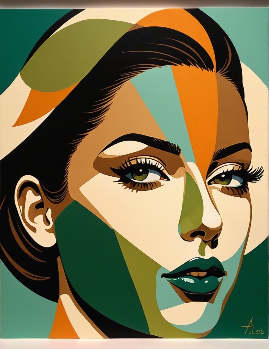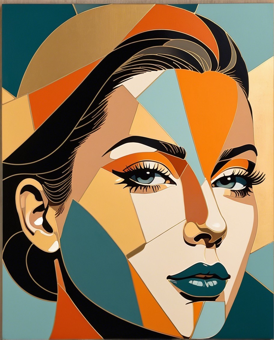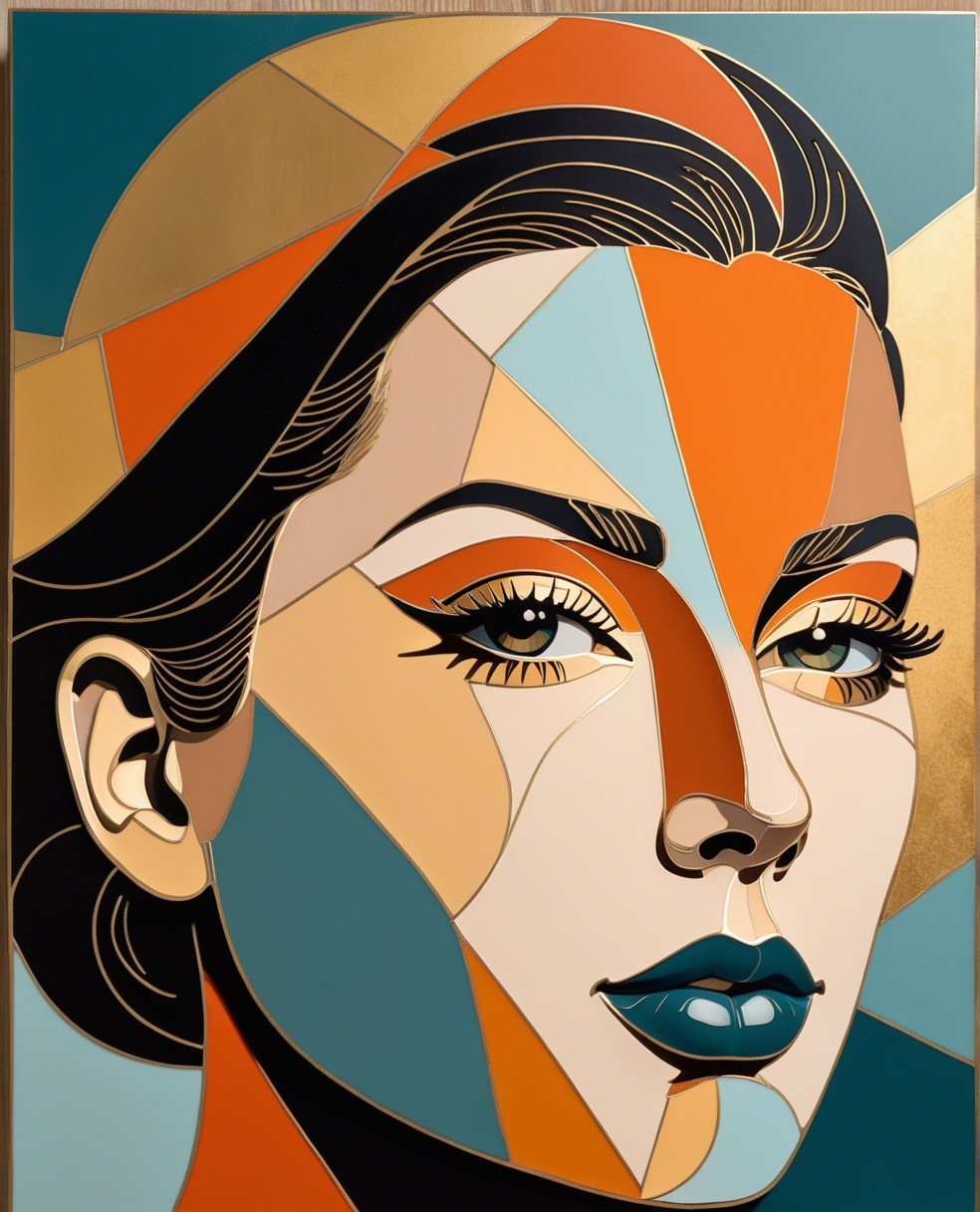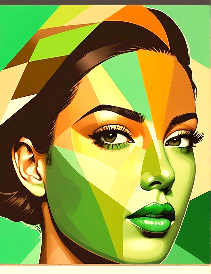 This artwork features a stylized portrait of a woman, composed of vibrant geometric shapes in shades of orange, blue, and gold, creating a modern and visually striking aesthetic.