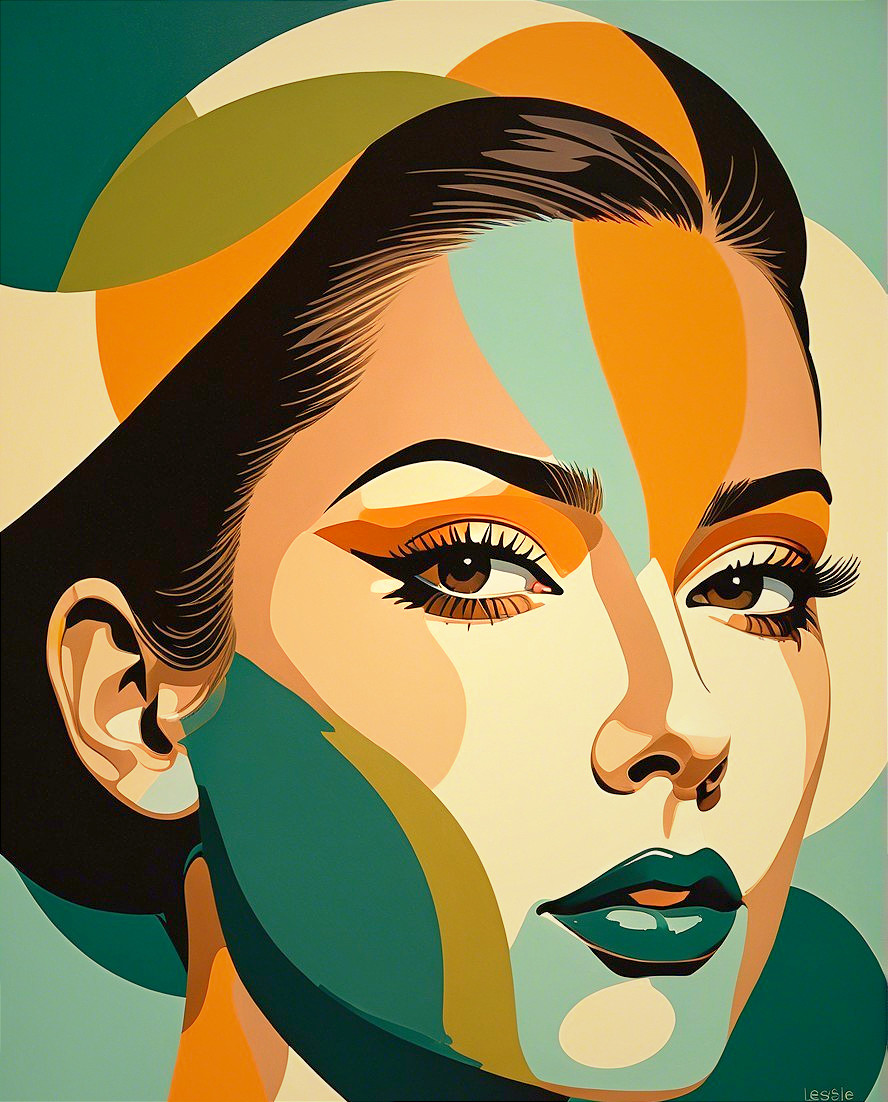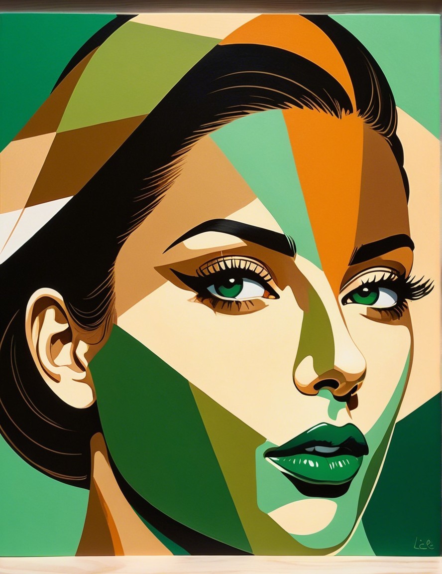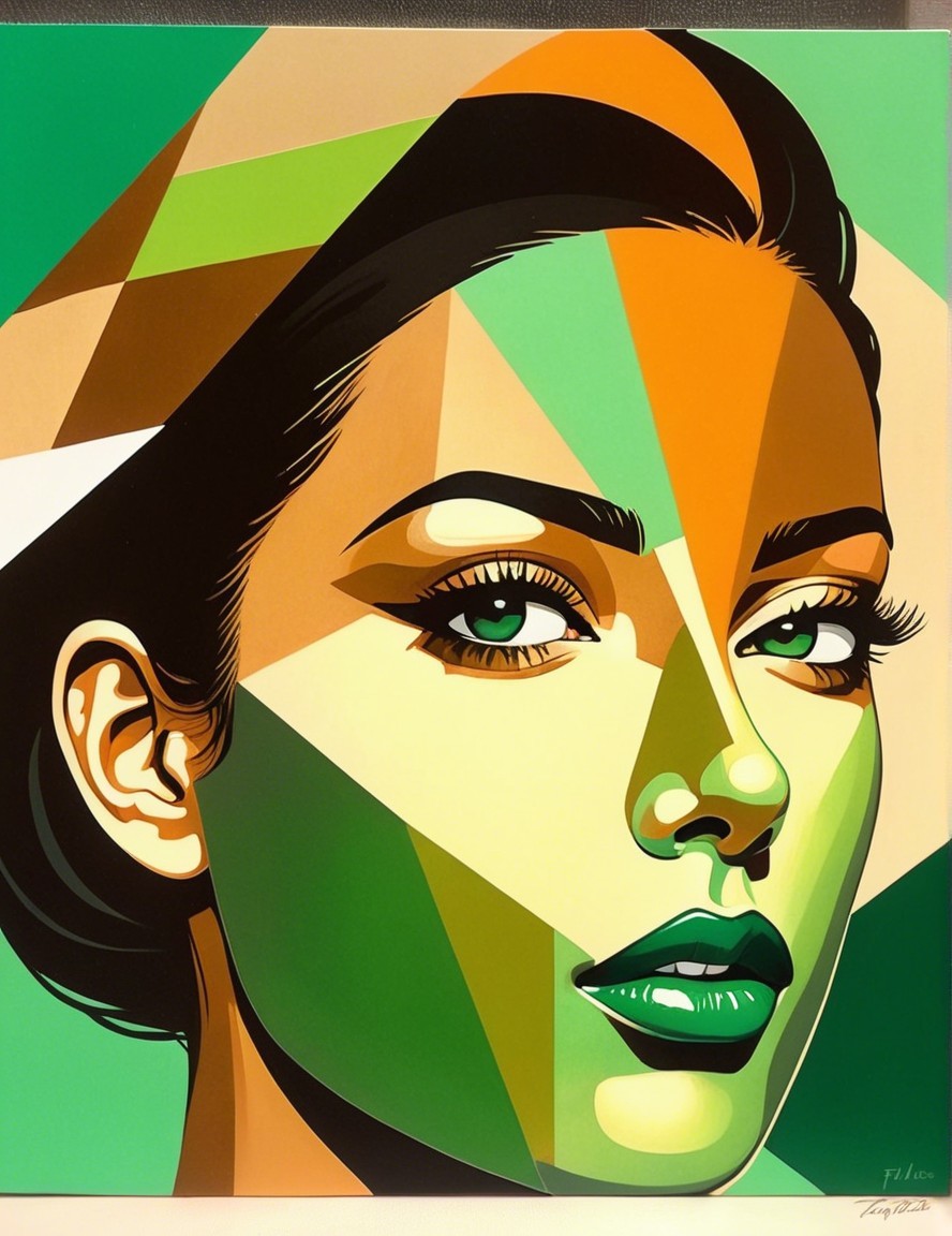 This artwork features a stylized portrait of a woman, composed of vibrant geometric shapes in shades of orange, blue, and gold, creating a modern and visually striking aesthetic.