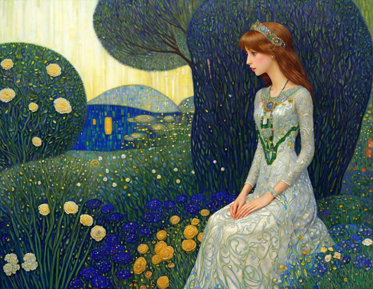 3D acrylic, attractive, very slight smile, beautiful, award winning, subtle, intricate, satiny, high quality, shimmering elegant style with the colors in nature, elegant, highly detailed, glistening magic style, in the style of Jan Toorop, with elements of the style of Gustav Klimt and subtle elements the style of Tingatinga